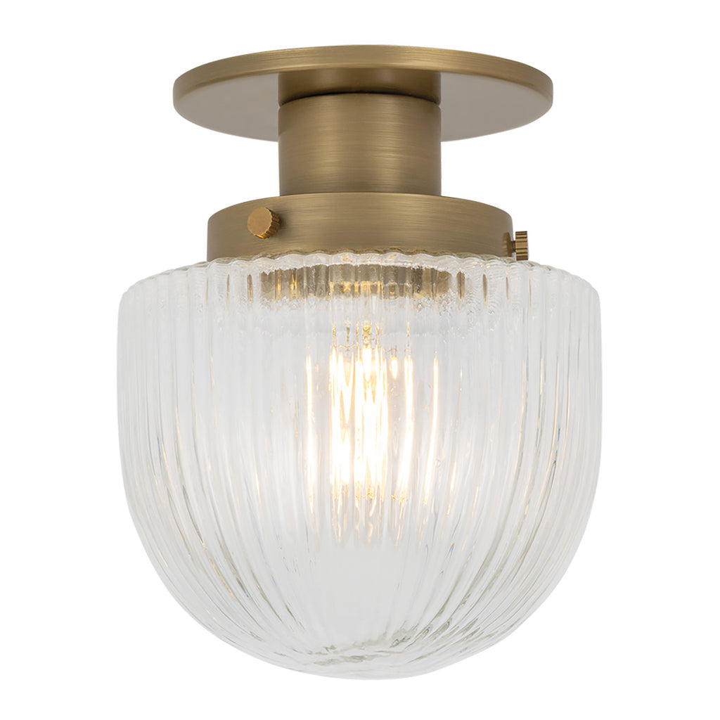 A compact companion to the Glint, Lauren Liess x Troy Lighting Jar is a charming semi-flush mount featuring a clear, fluted borosilicate glass shade. This petite downlight is a stylish alternative to traditional recessed lighting, offering a touch of vintage inspiration with modern simplicity. Finished in Patina Brass, Jar blends seamlessly into a variety of spaces—from kitchens to hallways.