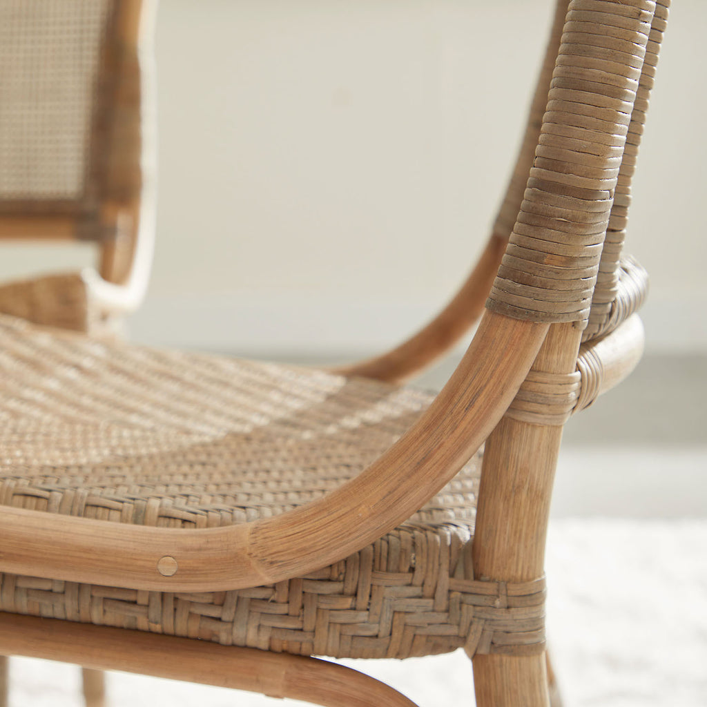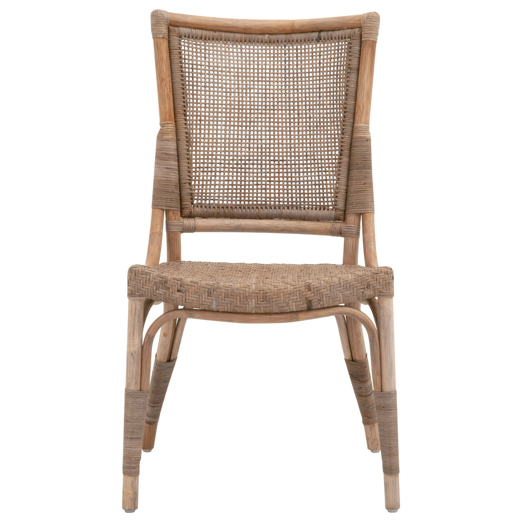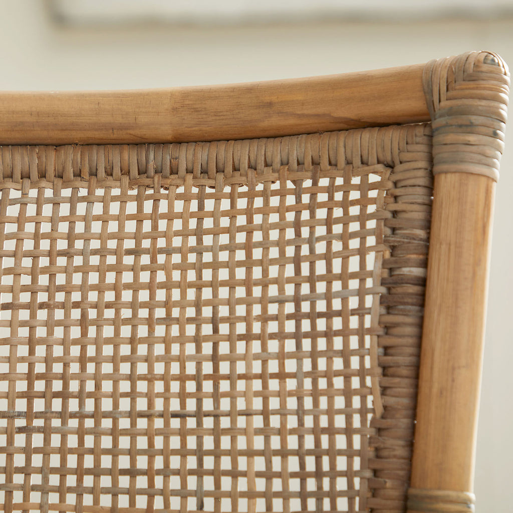 Add a bit of exotic flare to your dining room with this natural rattan Luna Dining Chair by Essentials For Living. It measures 20.75" wide, 23.75" deep, 36.25" high, with a seat height of 17.75". This chair is crafted with a hand-shaped rattan pole frame that is wrapped with matte gray binding on the legs and seat back. Both the seat and seat back are slightly curved for comfort and design. The seat is constructed with a rattan peel woven in a herringbone pattern. The cane-like back adds a traditional look to the chair, which can nicely fit with other traditional and transitional dining room furniture pieces.
