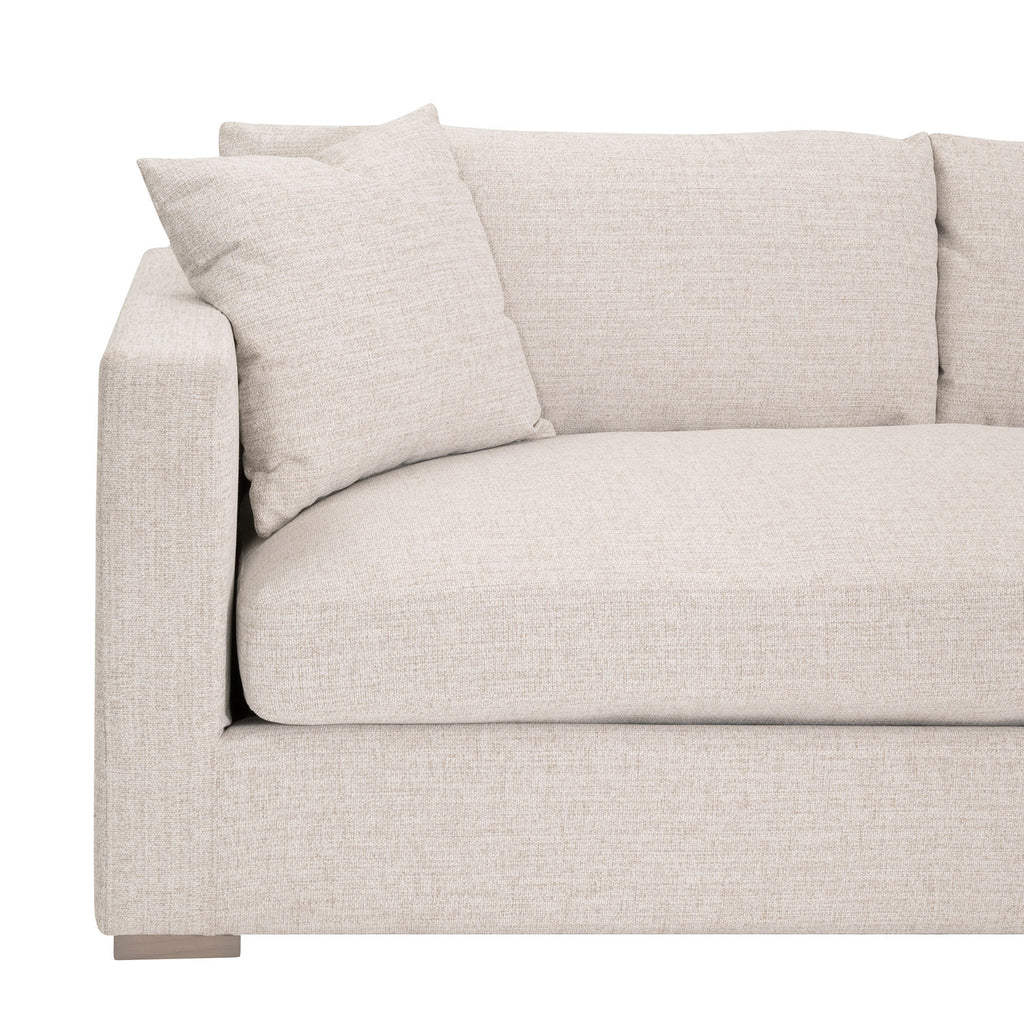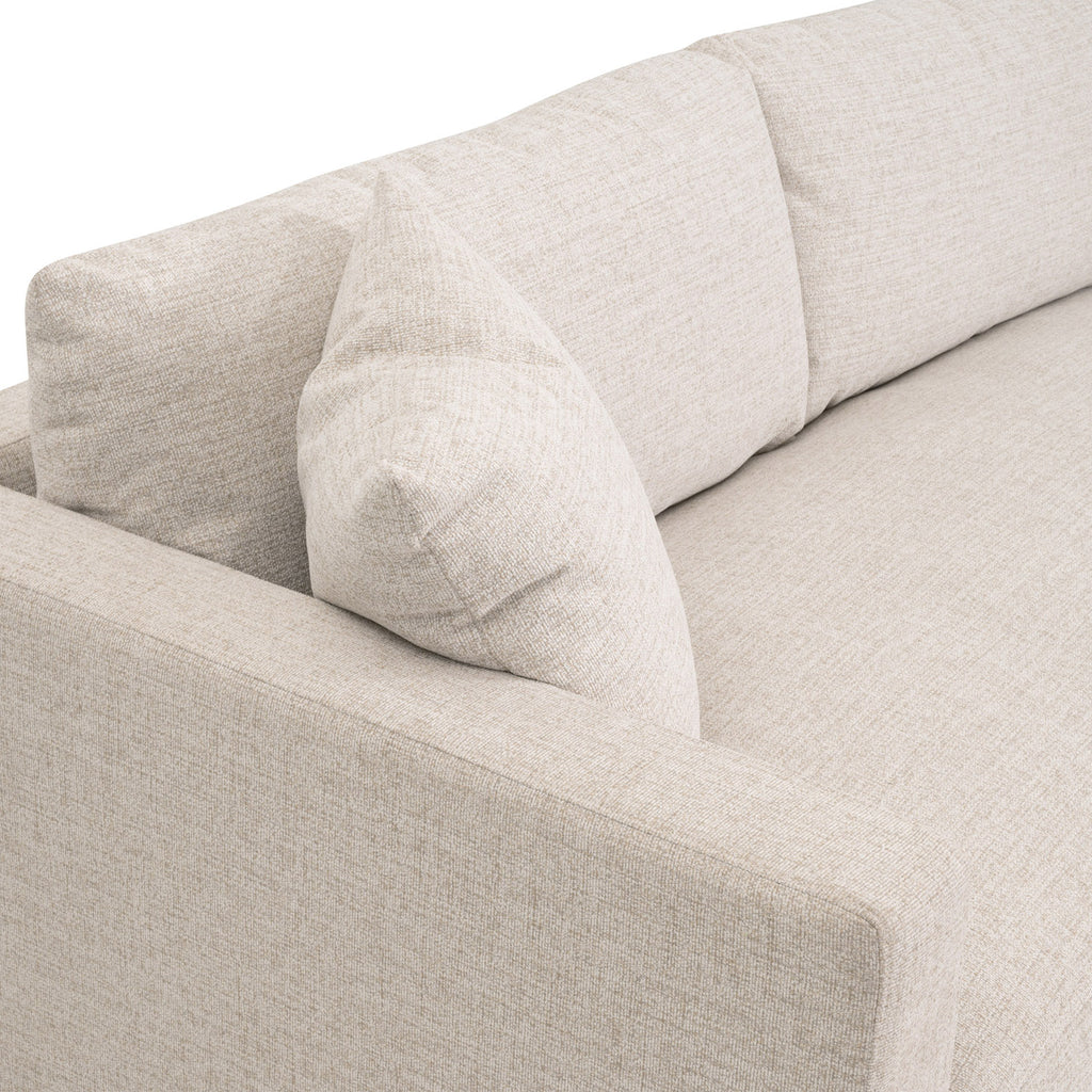 Designed for versatility and built to withstand the elements, the Newport Outdoor Modular 2-Seat 1-Left Arm Sofa by Essentials For Living brings upholstered indoor style to outdoor lounging. With a wide 76.5" seat and 20" seat height, this piece offers generous comfort, supported by outdoor-rated webbing over a high-density, marine-grade plywood frame. The desert-finished solid Accoya wood adds natural warmth and durability, while removable cushions upholstered in LiveSmart Shapiro Sand fabric resist moisture and fading. Cushions are filled with air fiber polymer and Dacron wrap for lasting structure and softness (they should be stored away in extreme weather and heavy rain). Part of a modular sofa system, it allows flexible arrangements to suit any outdoor setting.