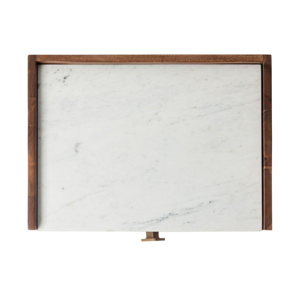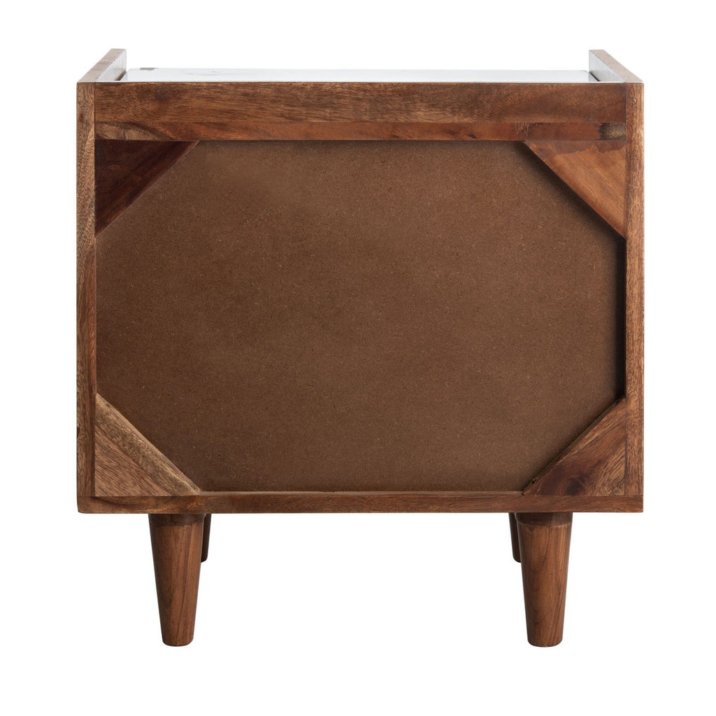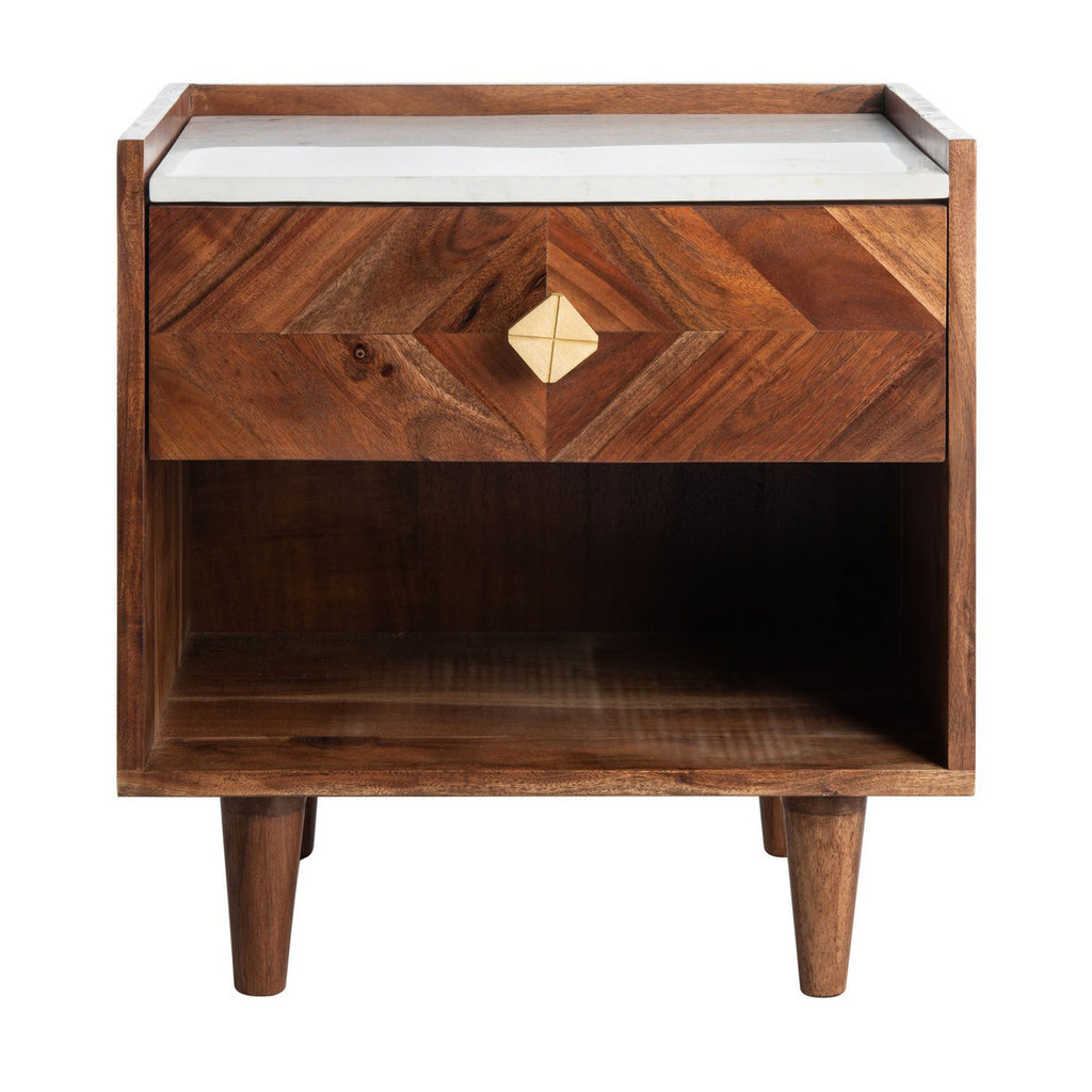 Add modern luxury to any bedroom with the rich textures on this contemporary nightstand. Finely crafted, its generous top drawer features a stunning diamond wood pattern and deluxe gold-finished hardware. Its faux white marble top makes it a new classic.