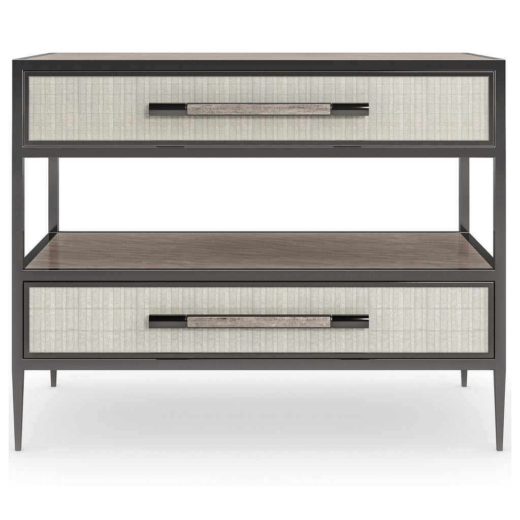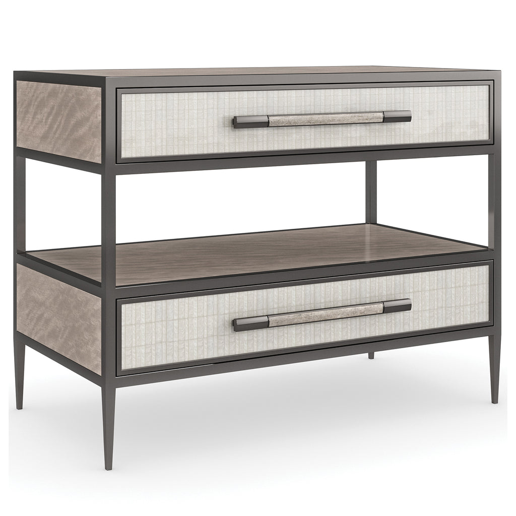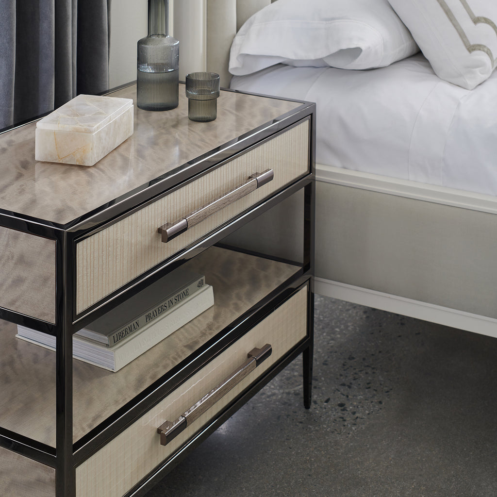 With its visually intriguing design and innovative mix of materials, this bedside table makes a luxe, organic statement. At the center of attention: Albino drawer fronts, hand-stamped with a cross-hatch pattern in hues of cream and alabaster, and accented by jewelry-like hardware with a ceramic inlay. Artfully framed by Deep Bronze metal, the top and sides boast a beautifully figured, linear wood grain in an earthy Mountain Smoke finish. Features two drawers and open storage for keeping nighttime reads.