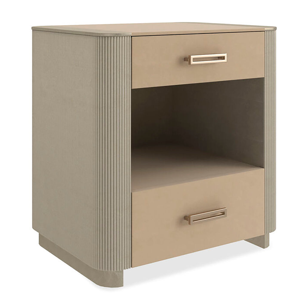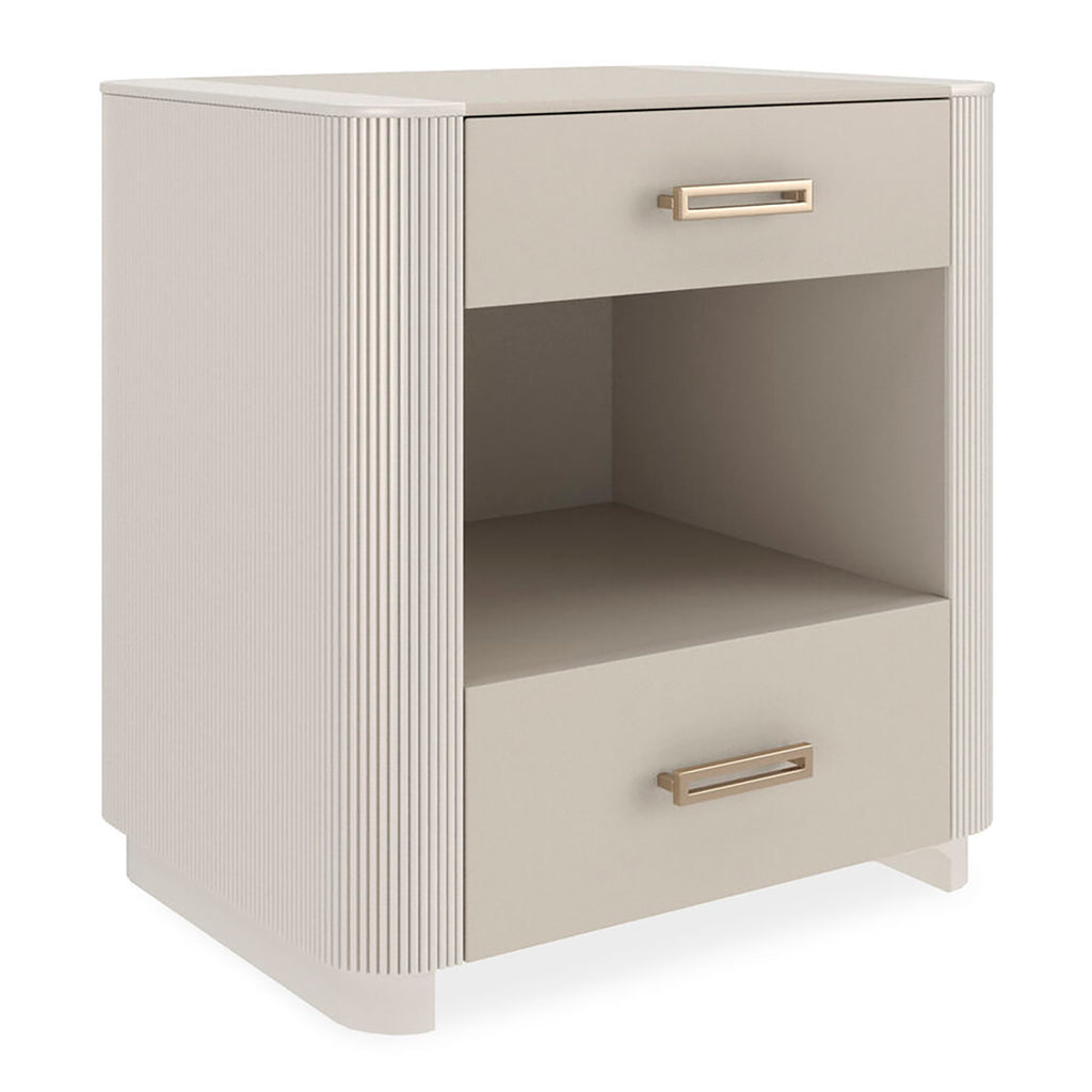 Cap the sides of your favorite bed with elegant nightstands that are just as dreamy. This 25-inch version boasts a fashion-forward design with a softly rounded profile accentuated by Matte Pearl paint, exquisite fluted sides and vinyl wrapped drawer fronts. Lustrous from every angle, it features a sophisticated palette of finishes. Ring-pull hardware with the look of jewelry in Whisper of Gold adorn both the top and bottom drawers.