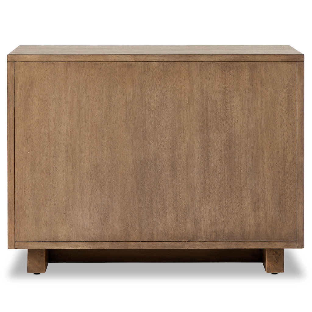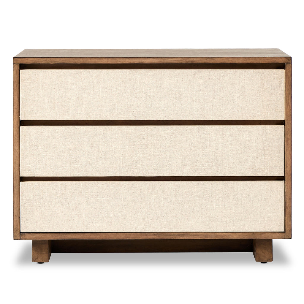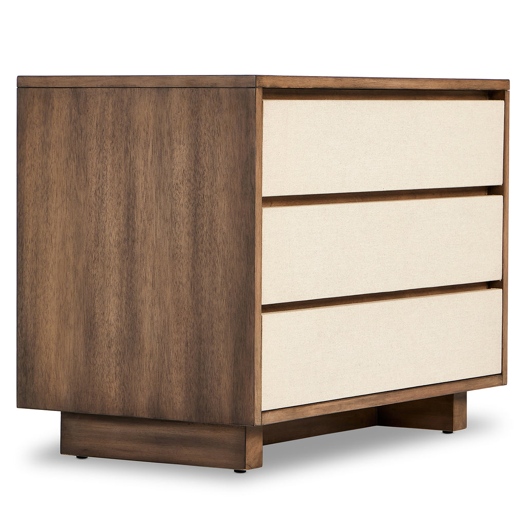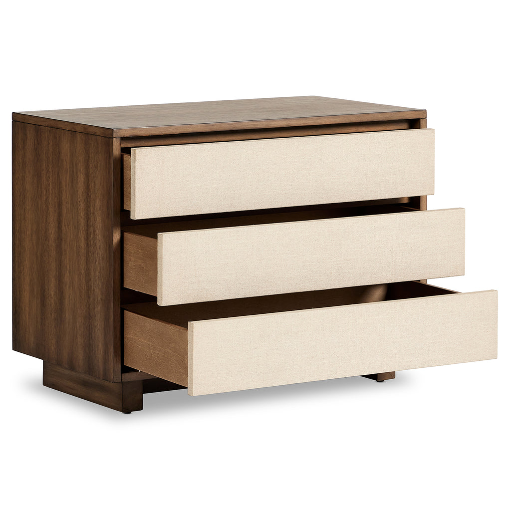 Simply shaped with a ski-leg base, painted linen drawer fronts complement the mahogany case. Three drawers allow for ample storage in this low, modern nightstand.