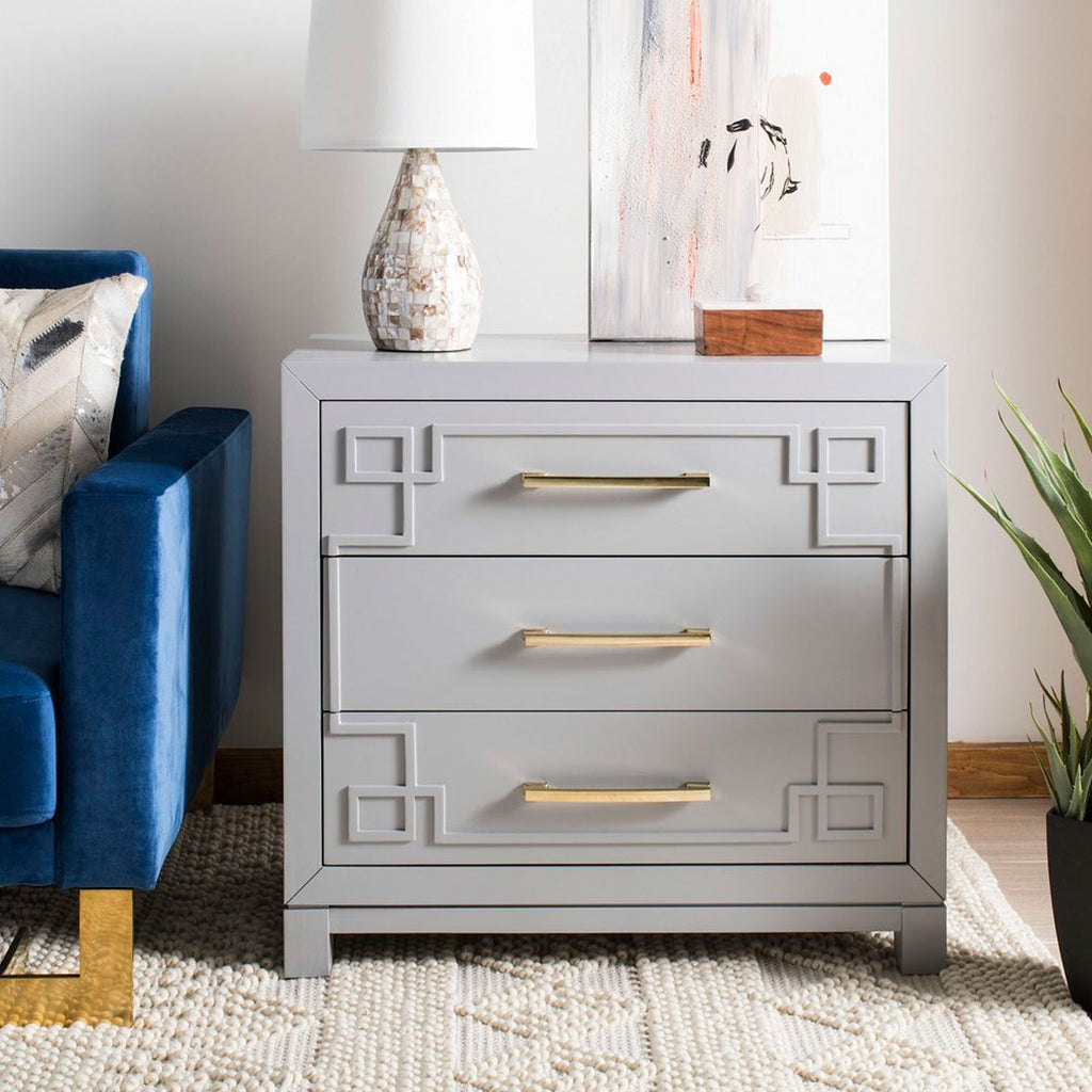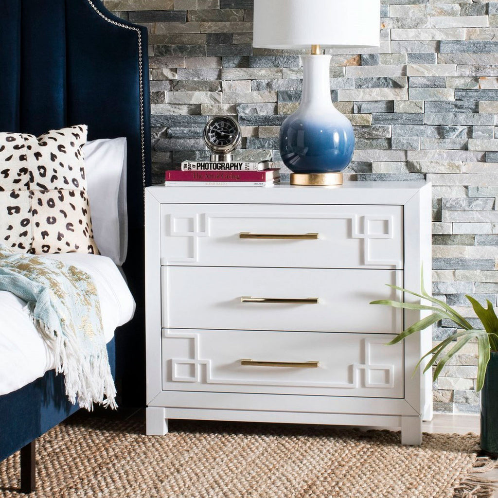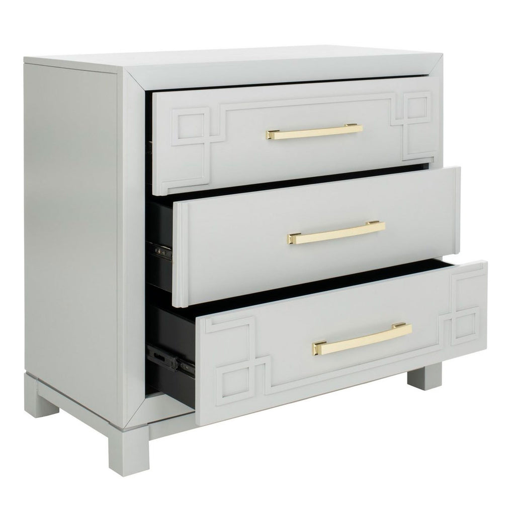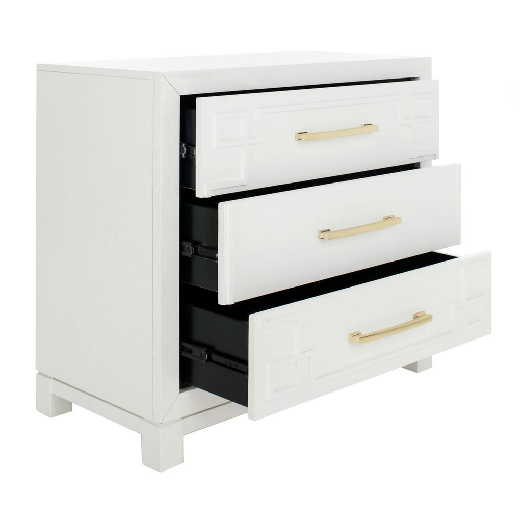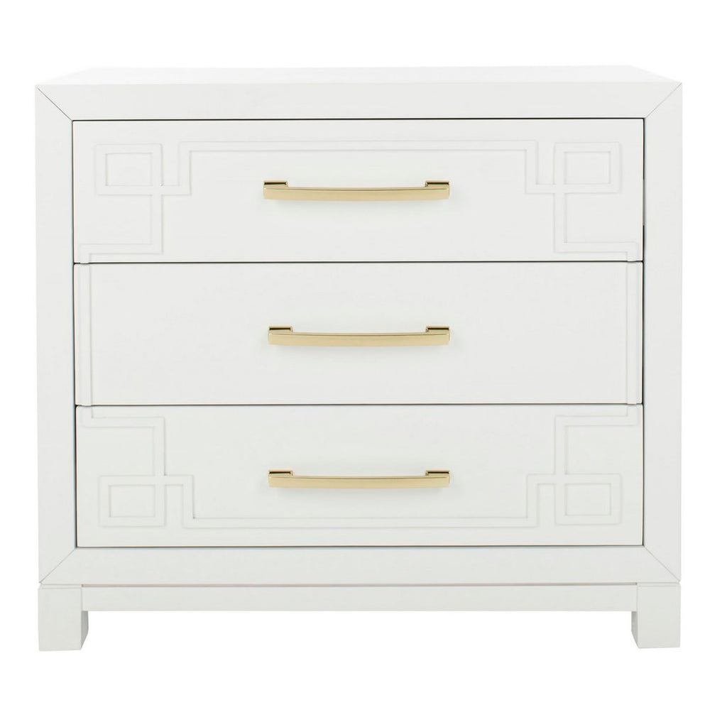 Inspired by Art Deco style, with this vibrant 3-drawer chest makes a bold statement in any bedroom or living room. Crafted with pine, it features striking carved details and a smooth white finish highlighted by deluxe gold-finished hardware. A modern heirloom.