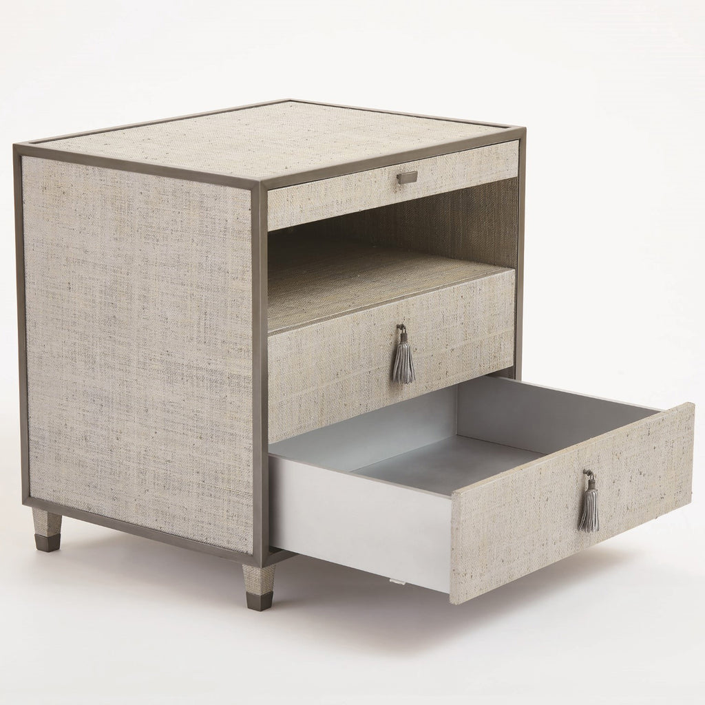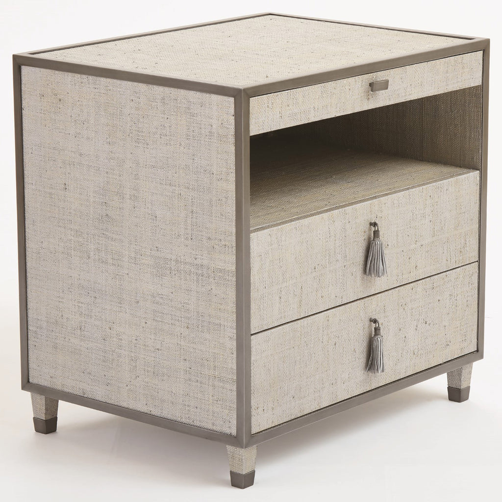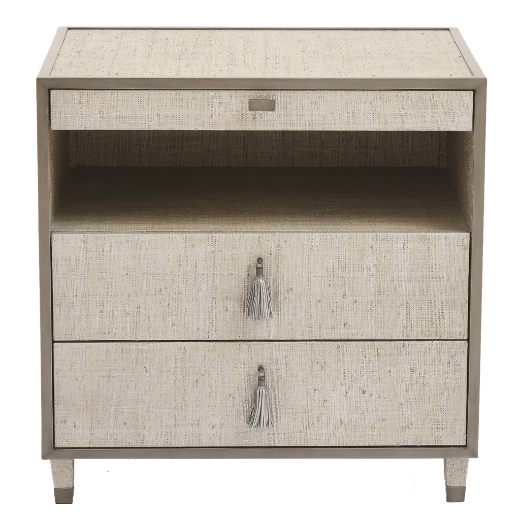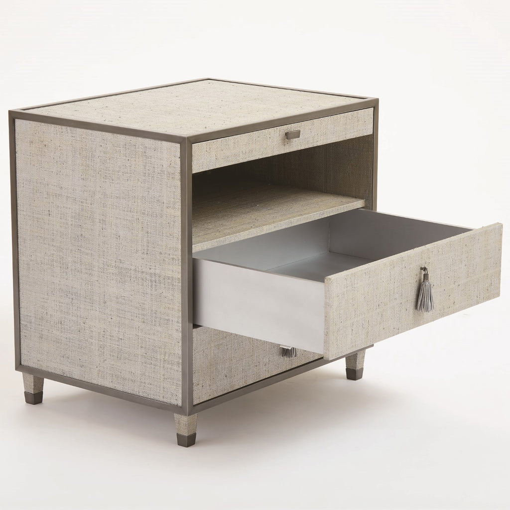 The Argento bedside chest is inspired by finely textured, intricate Florentine silverwork, mixing soft shine and modern silhouettes. Each piece mixes silvered raffia coverings with pewter metal trim.
