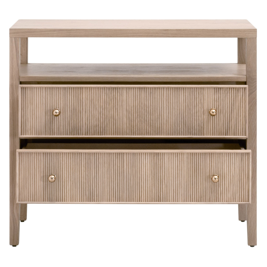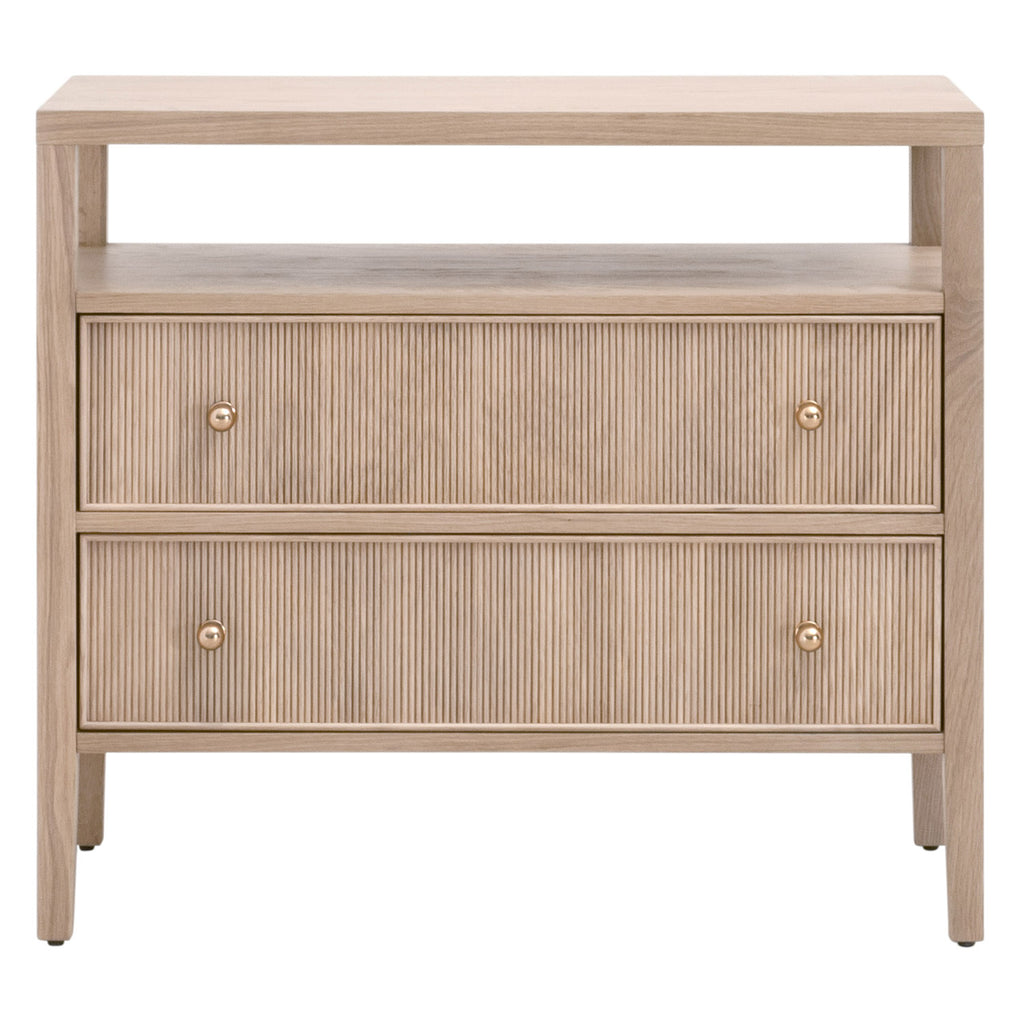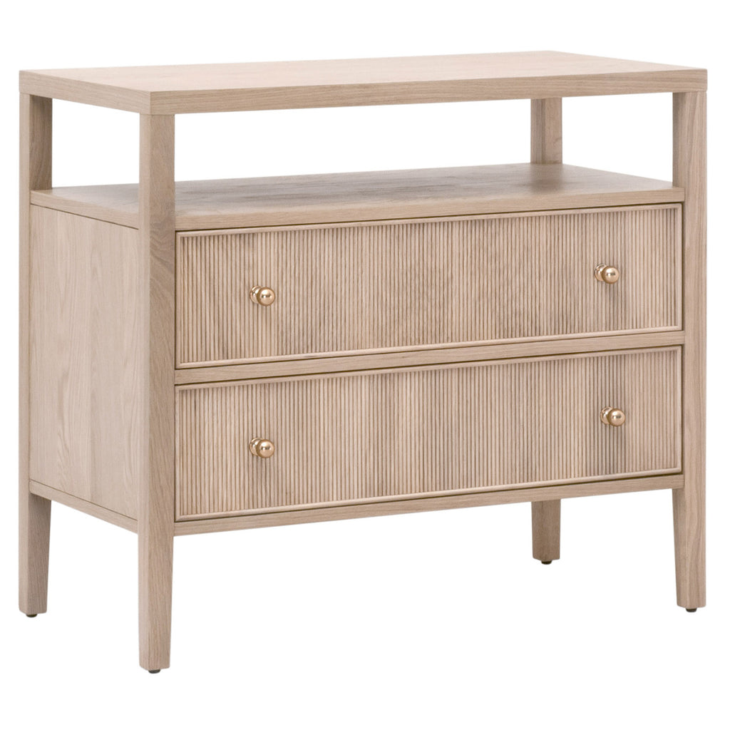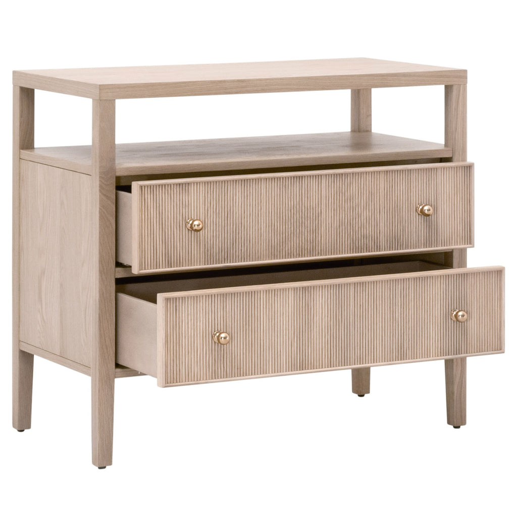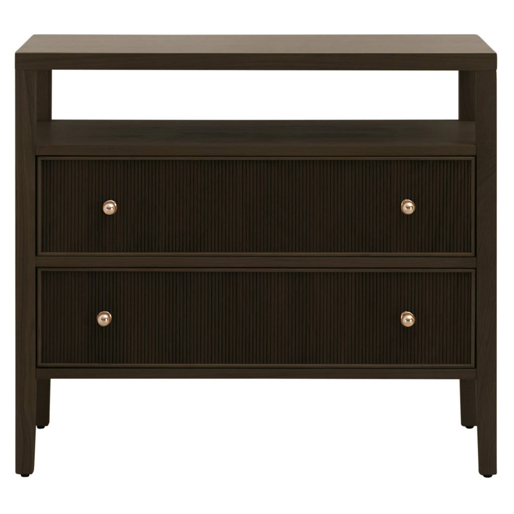 The Highland Open Shelf 2-Drawer Nightstand by Essentials For Living combines practicability and transitional style. Crafted from solid oak wood and oak veneer, this stunning nightstand is finished in rich Dutch Brown Oak with polished brass drawer knobs. This wide nightstand measures 34in wide, 17in deep, and 30in high, providing ample storage space with its larger size. The two drawers feature fluted wood fronts for an eye-catching design. Dual metal glides offer smooth and secure opening and closing for storing your valuables. The top drawer is lined with felt for protection of delicate items. The open shelf adds versatility for displaying decor or storing essentials, making this nightstand both elegant and practical for any bedroom.