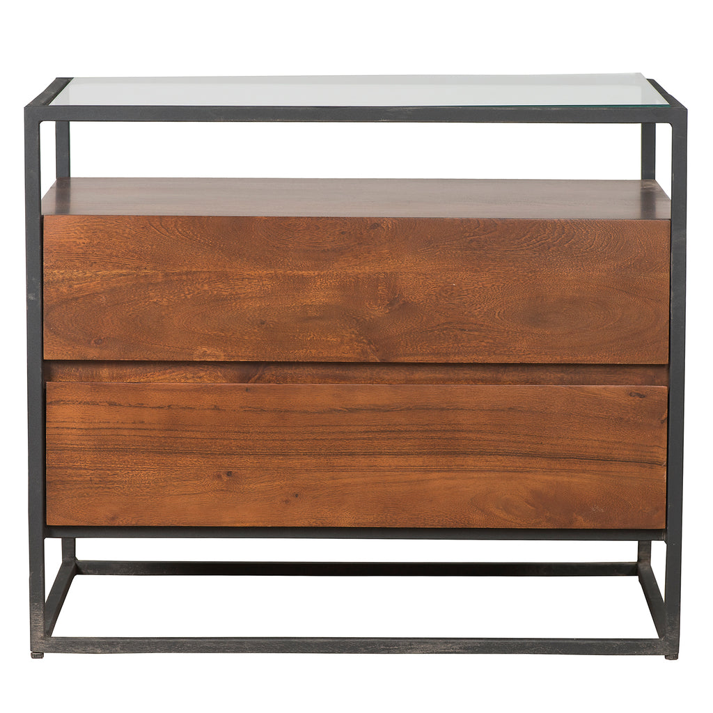 Distinct in style and always experimenting, Union Home Furniture adds expression to every room in the home with artfully crafted modern pieces. Crafted to nest inside a mild steel frame, the Union Home Bedford two drawer nightstand has plenty of storage. The space below the glass shelf is good for storing your bauble.