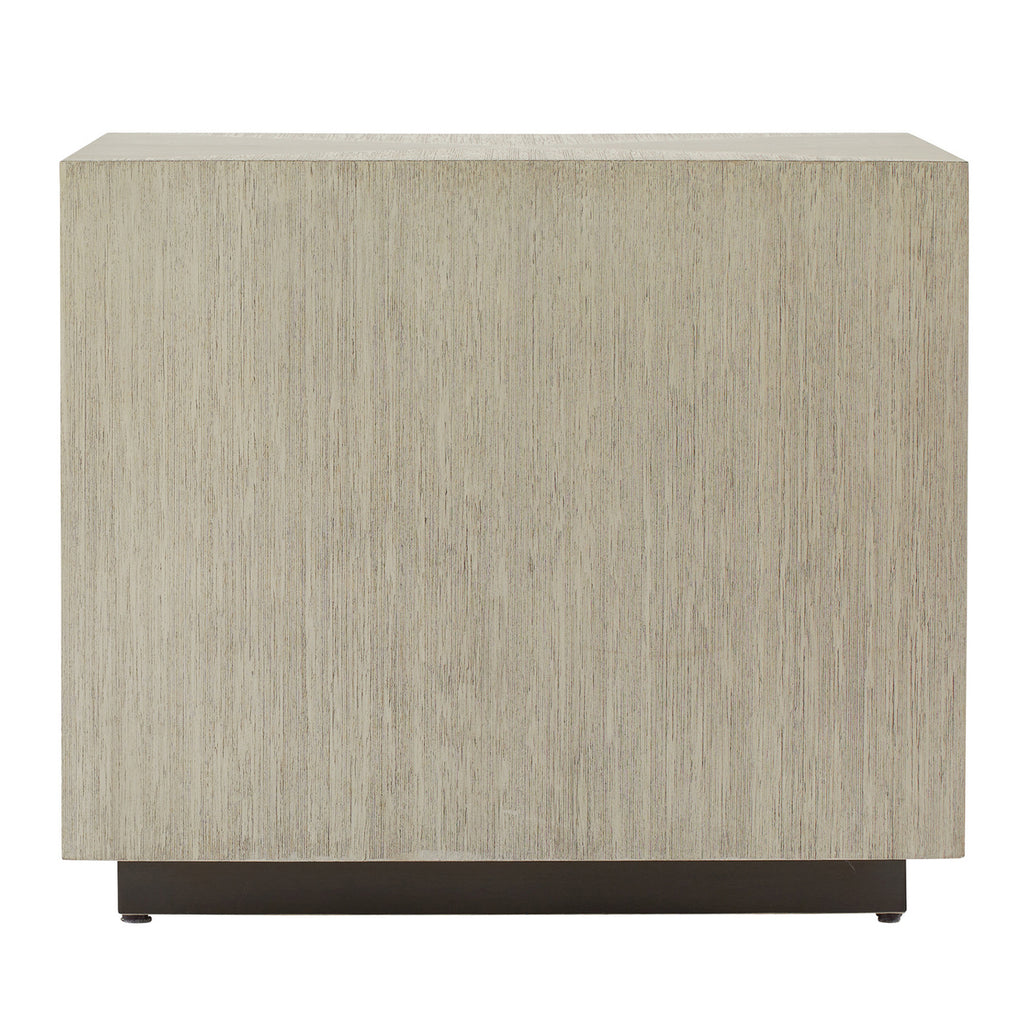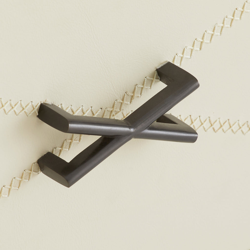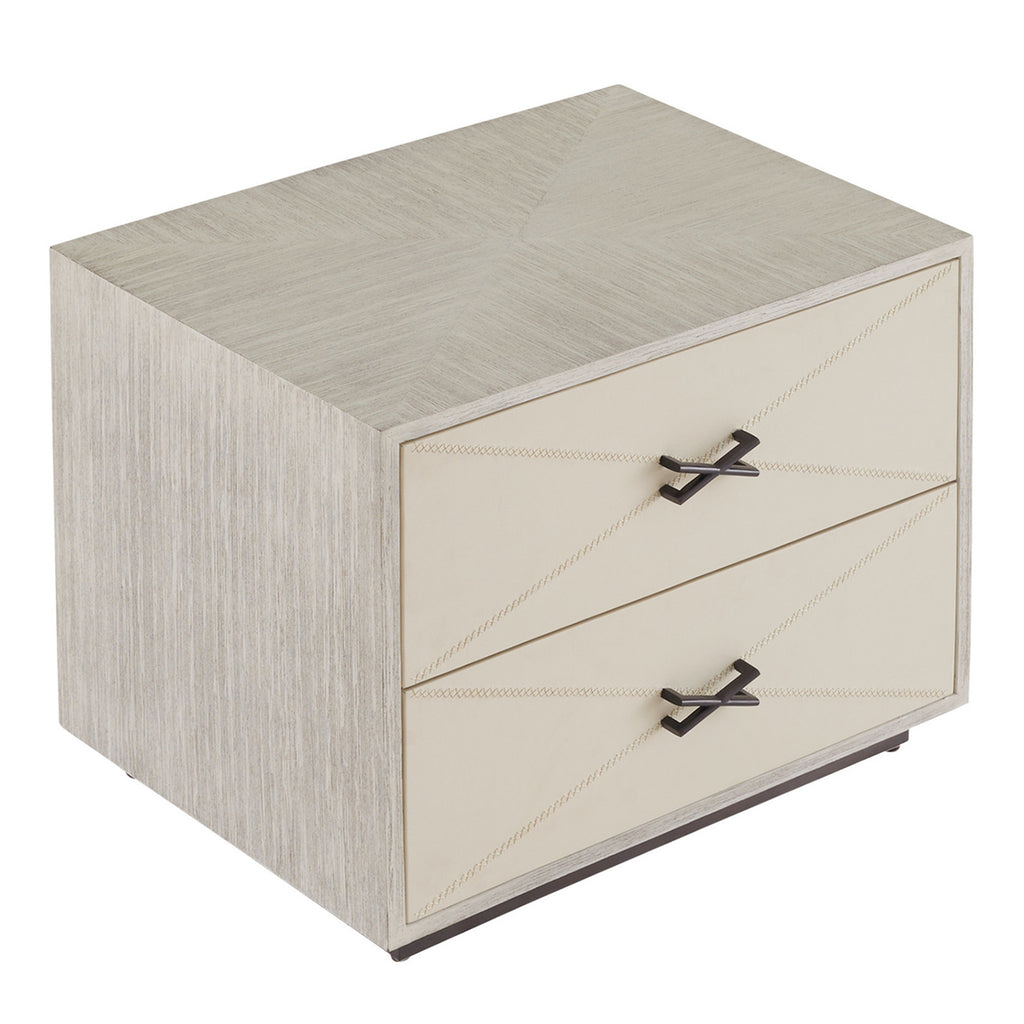 We borrowed whipstitch detailing from fine tailoring to adorn a side table of smoke oak wood. Each ivory leather-covered drawer is enhanced with cast brass hardware in an English bronze finish to mirror the linear shape of the stitching. Designed with a generous depth for storage, this sophisticated piece is fully veneered to float within the room. Includes soft-close drawers and an English bronze-plated stainless-steel base; leather will vary.