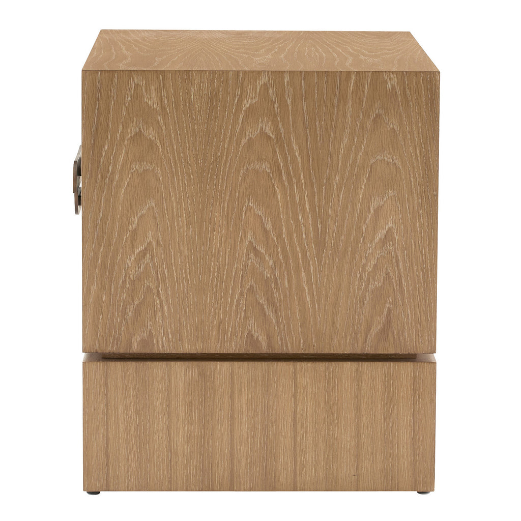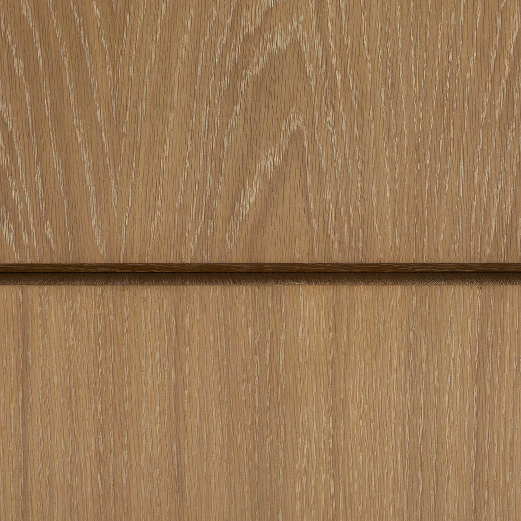 We adapted our classic Kianna credenza in a smaller size to perfectly pair with a bed or sofa. A white lacquer face is set within a veneered oak wood frame in an oyster finish, delivering style and function through architectural elements. Inspired by modernist sculpture, the curved door pulls are crafted in heritage brass, while the exaggerated base features a racing stripe reveal visible from every angle. Soft-close doors.