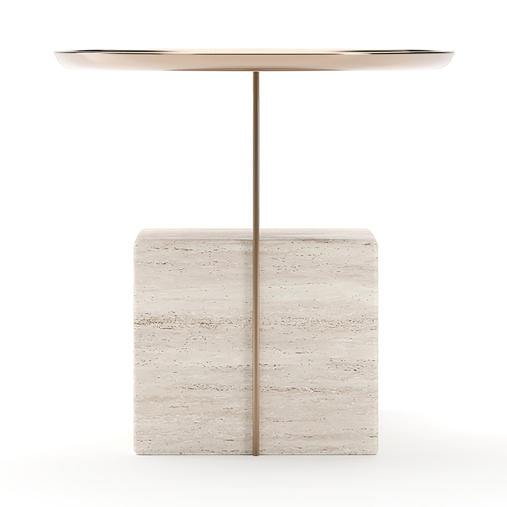 Showcasing understated elegance, the Overlap Nightstand Base Light blends minimalist sophistication with organic charm. Its distinctive unfilled Travertine stone base adds natural texture and individuality, crowned by a sleek metal tray finished in luminous Whisper of Gold. A graceful, versatile addition ideal for highlighting curated objects or bedside essentials, this nightstand effortlessly brings a touch of refined luxury to your decor.