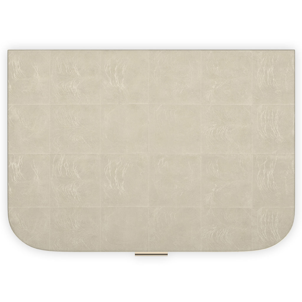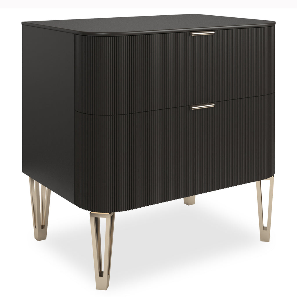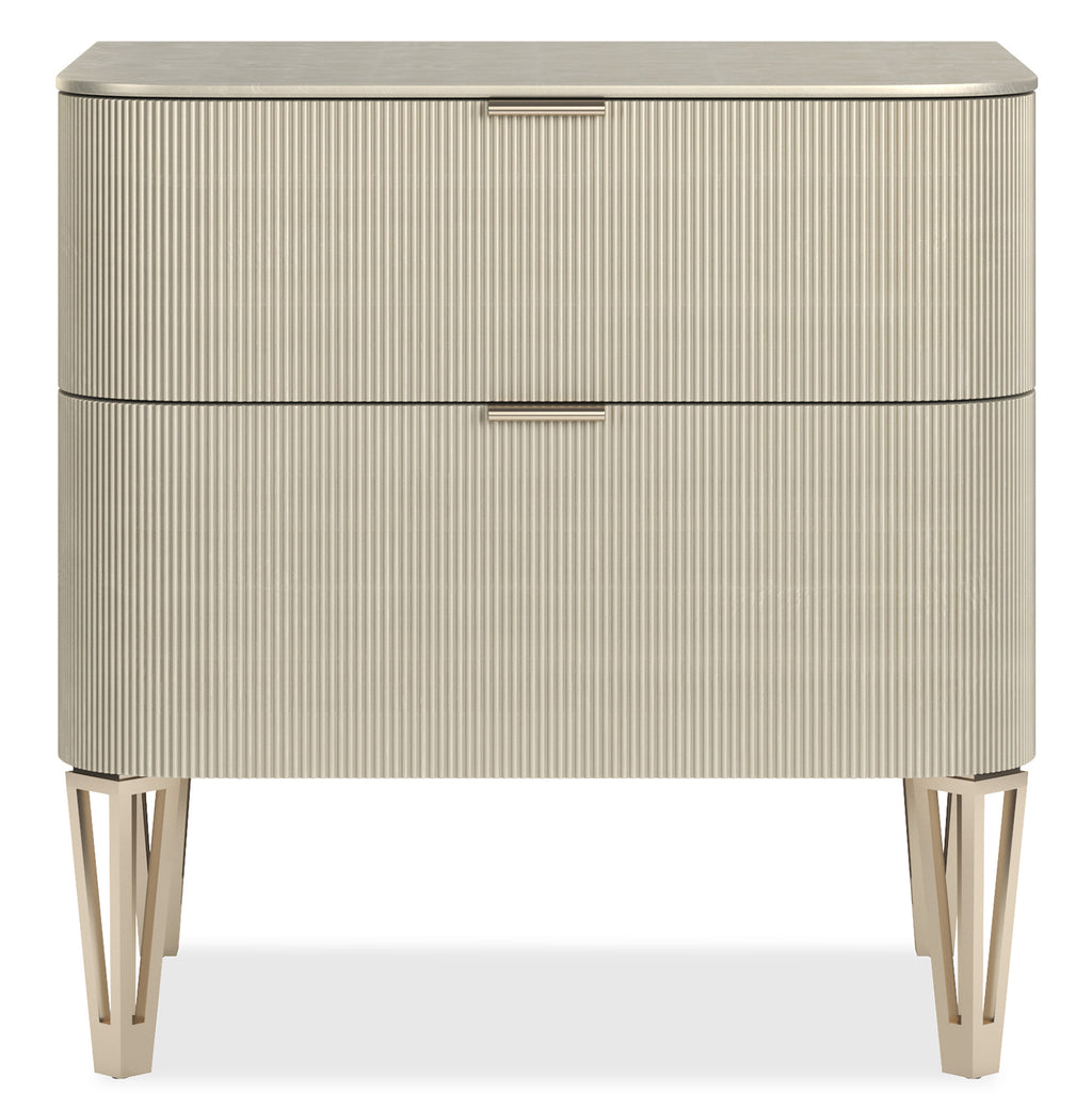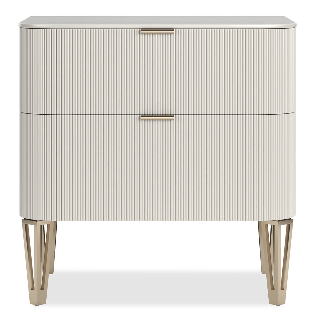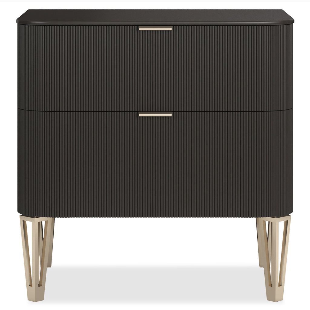 This is a more petite version of our True Love nightstand. A full-covering of gleaming Oracle gold, Dark Chocolate, or Matte Pearl accentuates the exquisite reeding on the drawer fronts with Whisper of Gold metal band detailing and designer legs. This piece has two under-mount drawers.