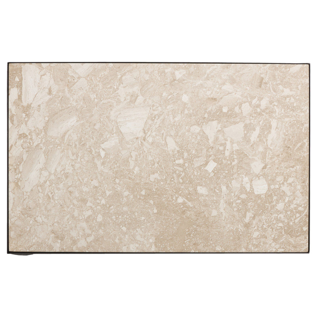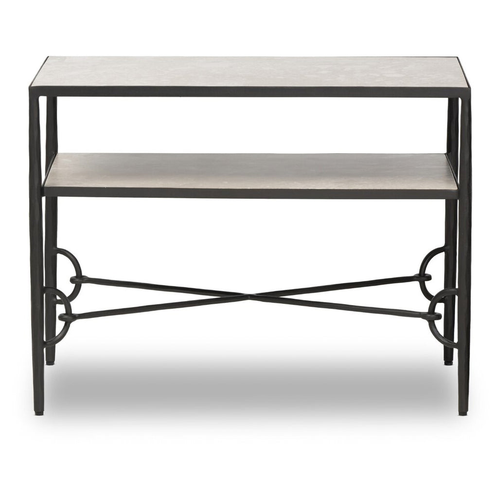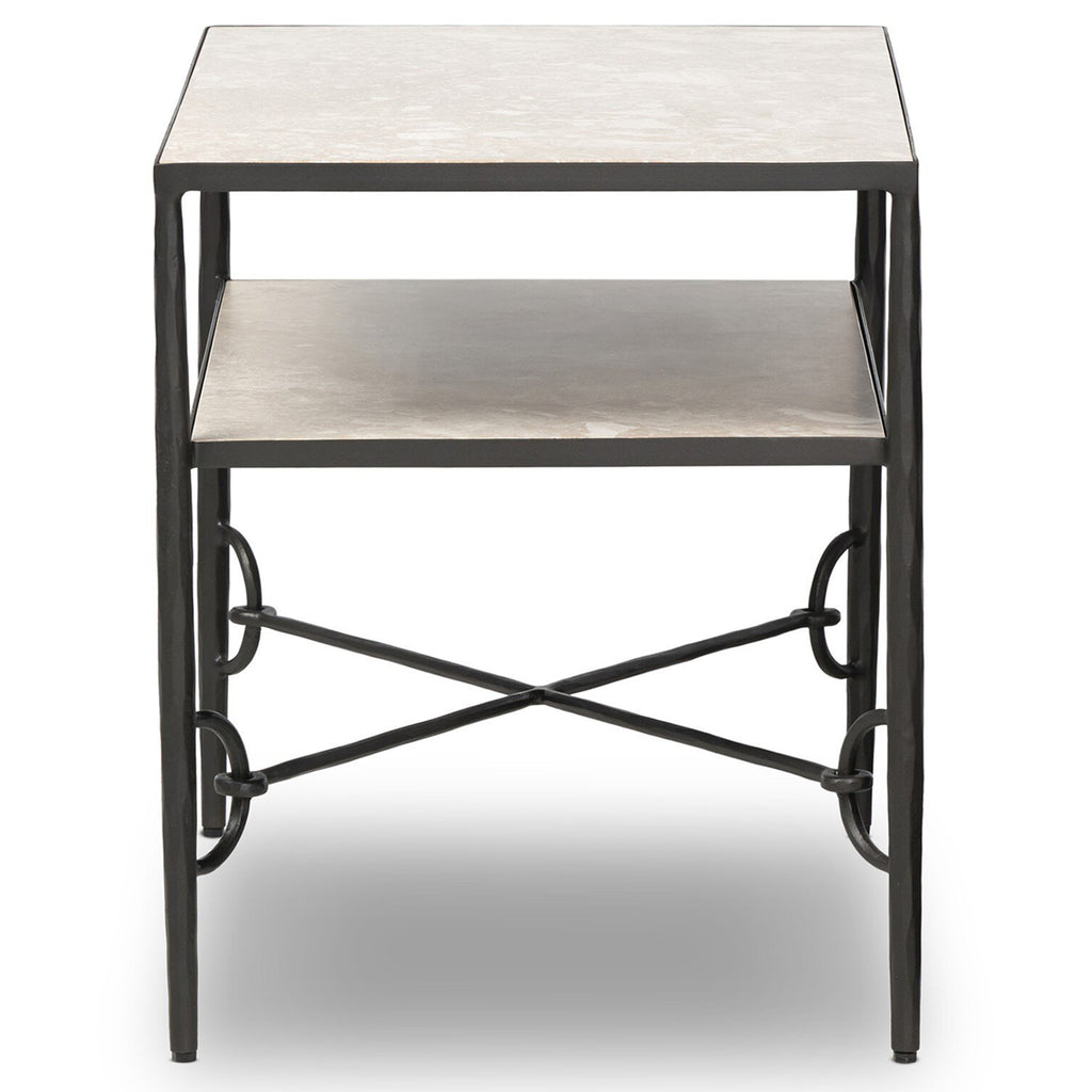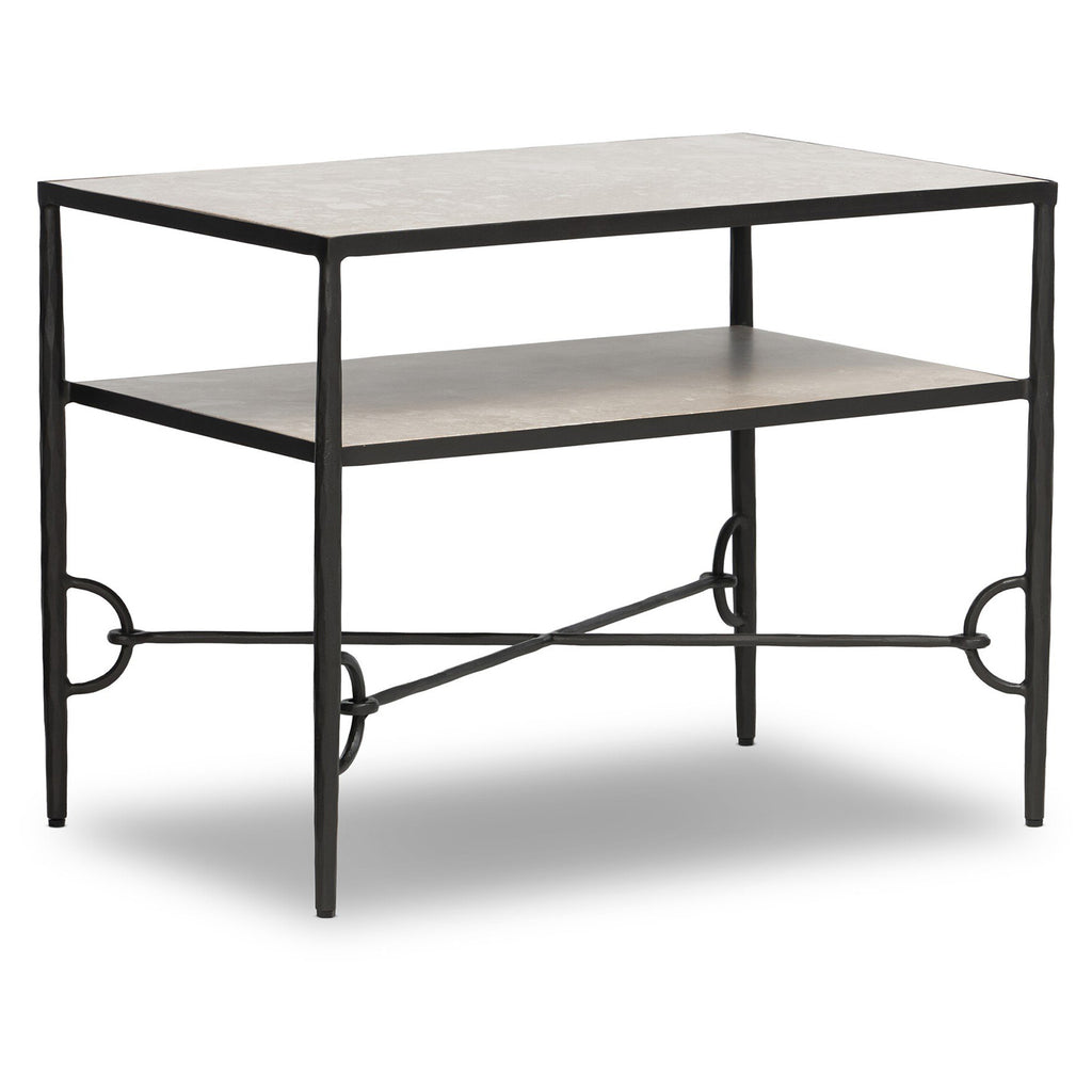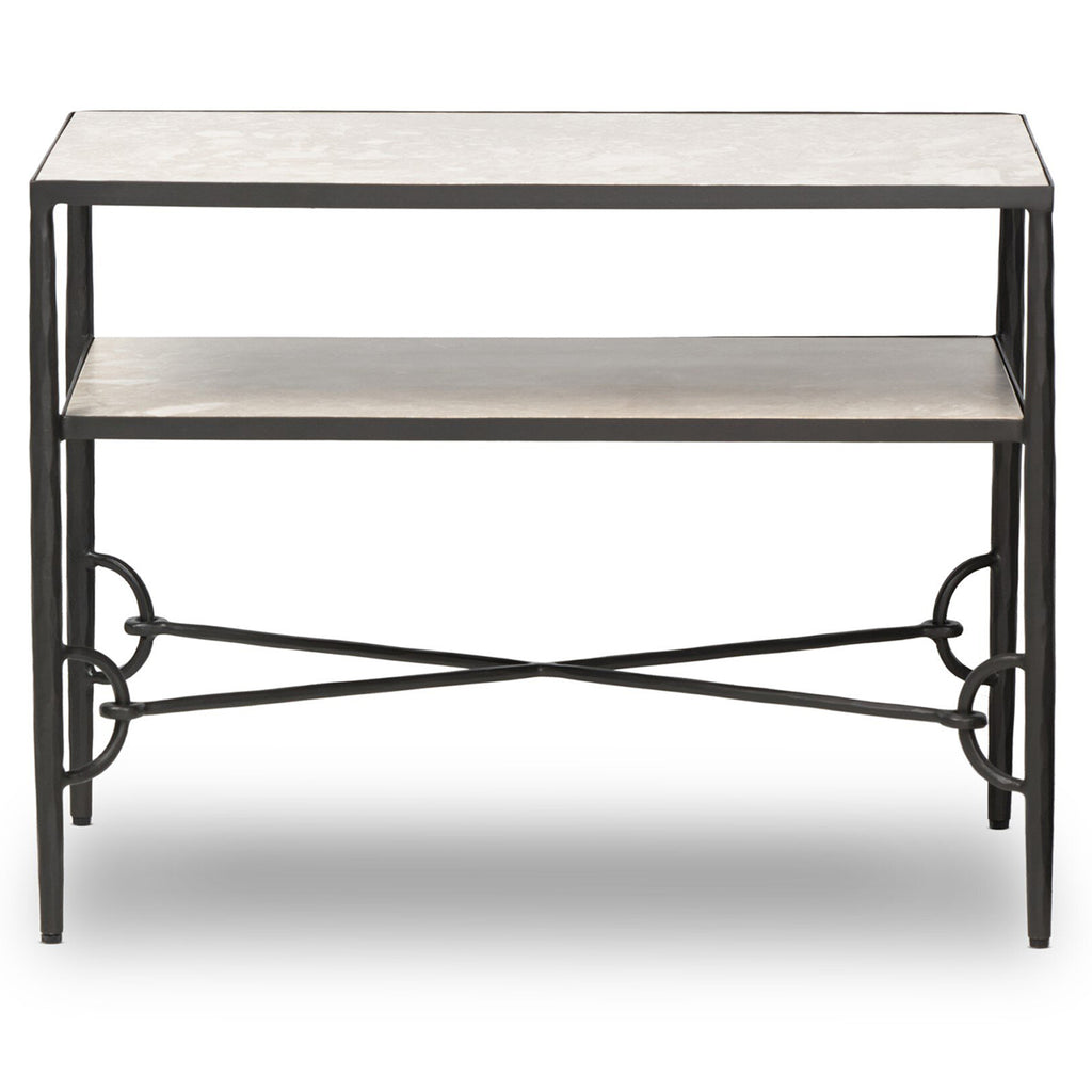 A slim, spare frame of hammered gunmetal pairs with natural metal, for a clean and timeless nightstand look. Stretchers attach to metal loops for an elevated design detail.