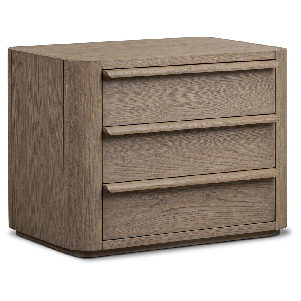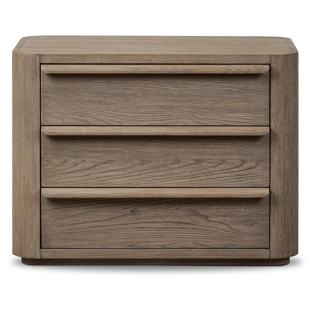 Rounded corners soften the straight-edged look of this three-drawer nightstand, crafted from natural oak in a warm grey finish. Wide smooth-gliding drawers are fully finished on the inside.