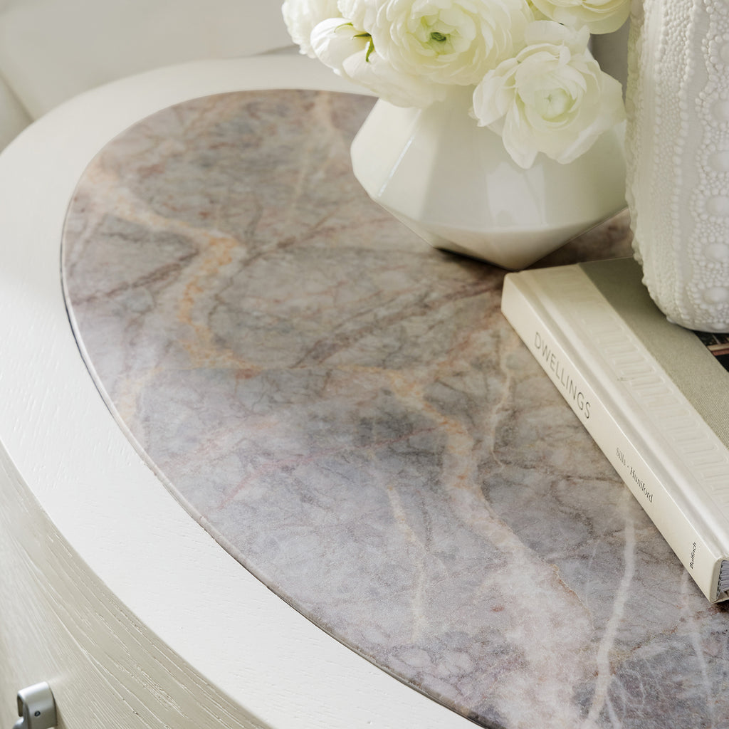 If you aspire to tranquil palettes and textures, the Serenity Wavecrest Oval Nightstand will bring the peacefulness of the outdoors inside with its light and airy soft textured Shell white finish and Honed Marble top. Crafted of Oak Veneers, the exquisite nightstand has 3 drawers with soft-close drawer guides, a finished back, USB charger with two ports and light champagne decorative ring pulls.