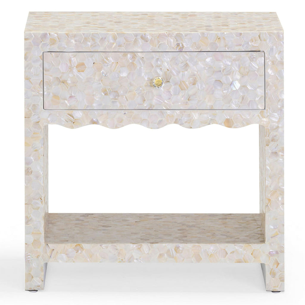 The Piara Nightstand is wrapped in hand-laid mother of pearl, its surface catching light with an opalescent glow that feels both airy and rich. Detailed with a scalloped edge and a smooth-glide drawer, this artisanal piece blends natural shell shimmer with soft, sculptural lines.