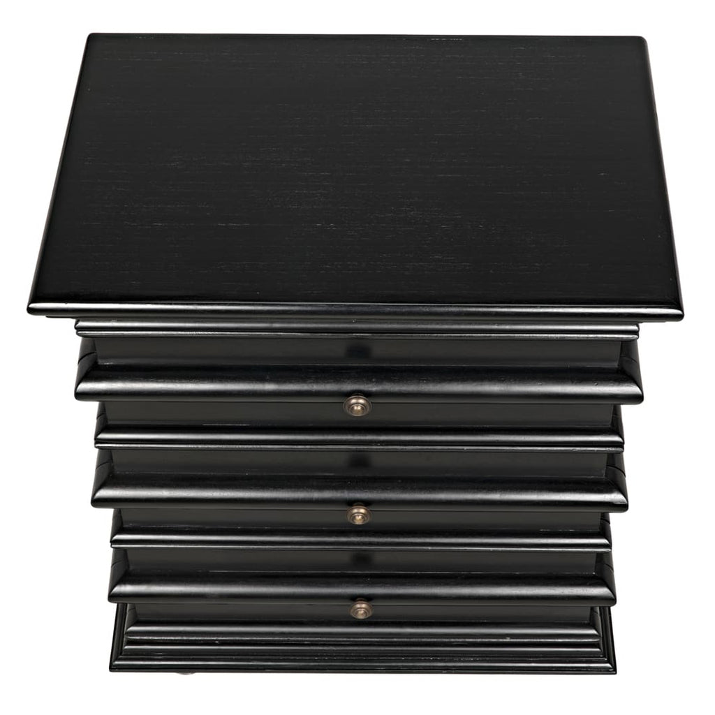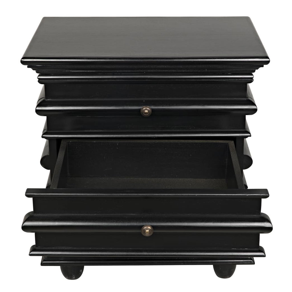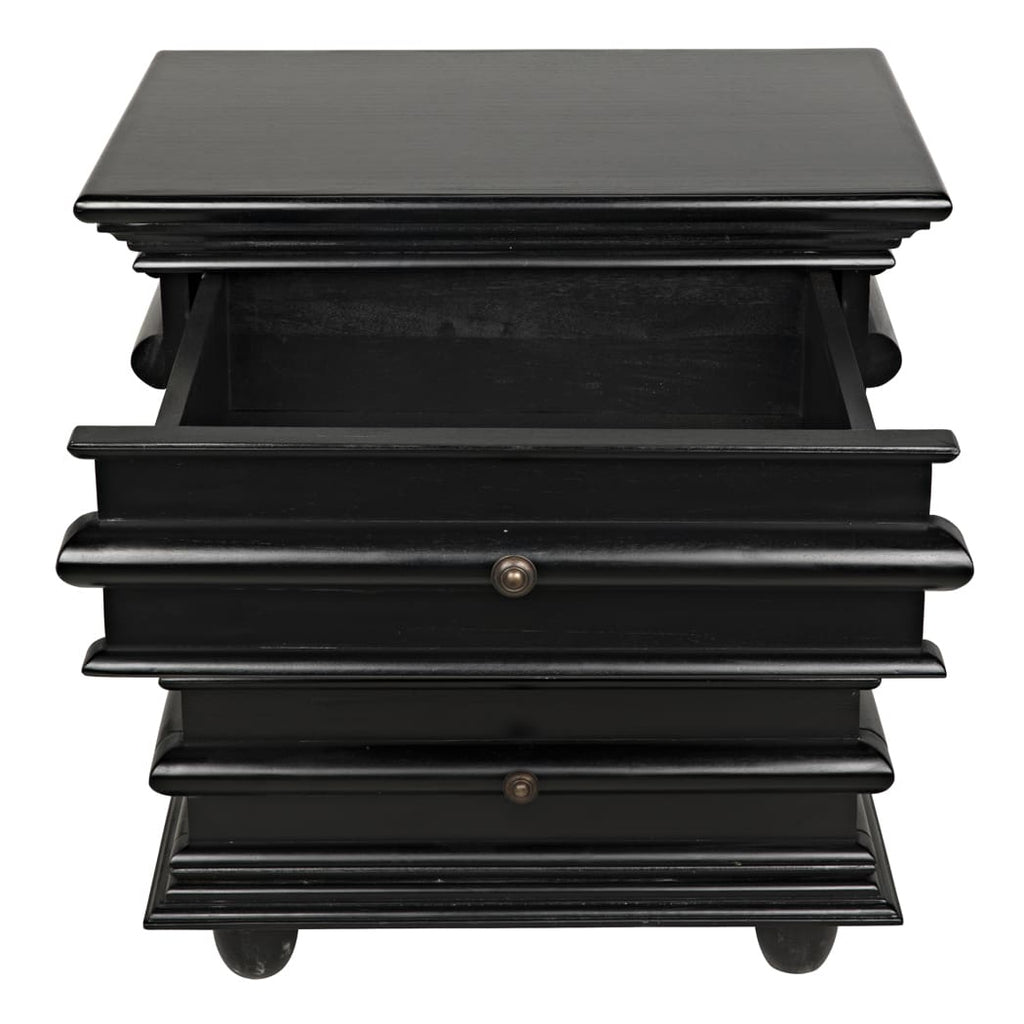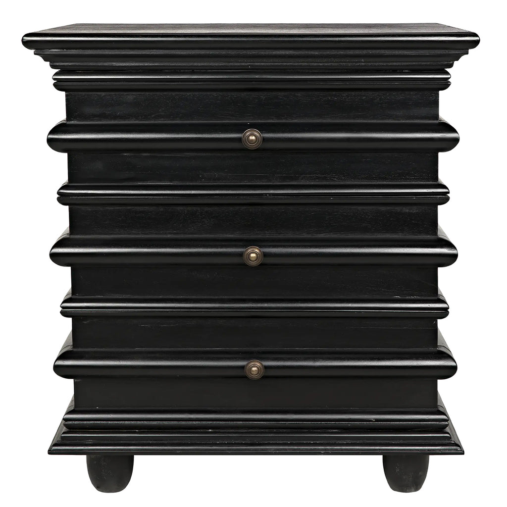 This elegant Noir table accents living rooms and bedrooms with contemporary function. Versatile to match a variety of aesthetics, this furnishing adds style to any space. With a design inspired by the jacket of a classic first edition, this handsome, handcrafted Noir Ascona side table features bun feet topped with an elaborately ribbed design. Finished in hand-rubbed stain, it has three generous drawers and coordinating hardware.