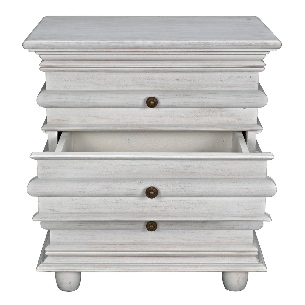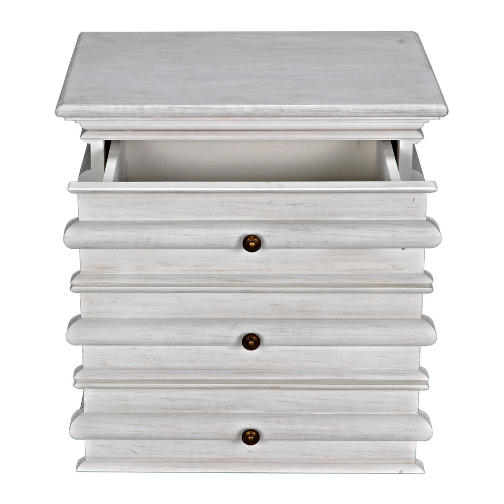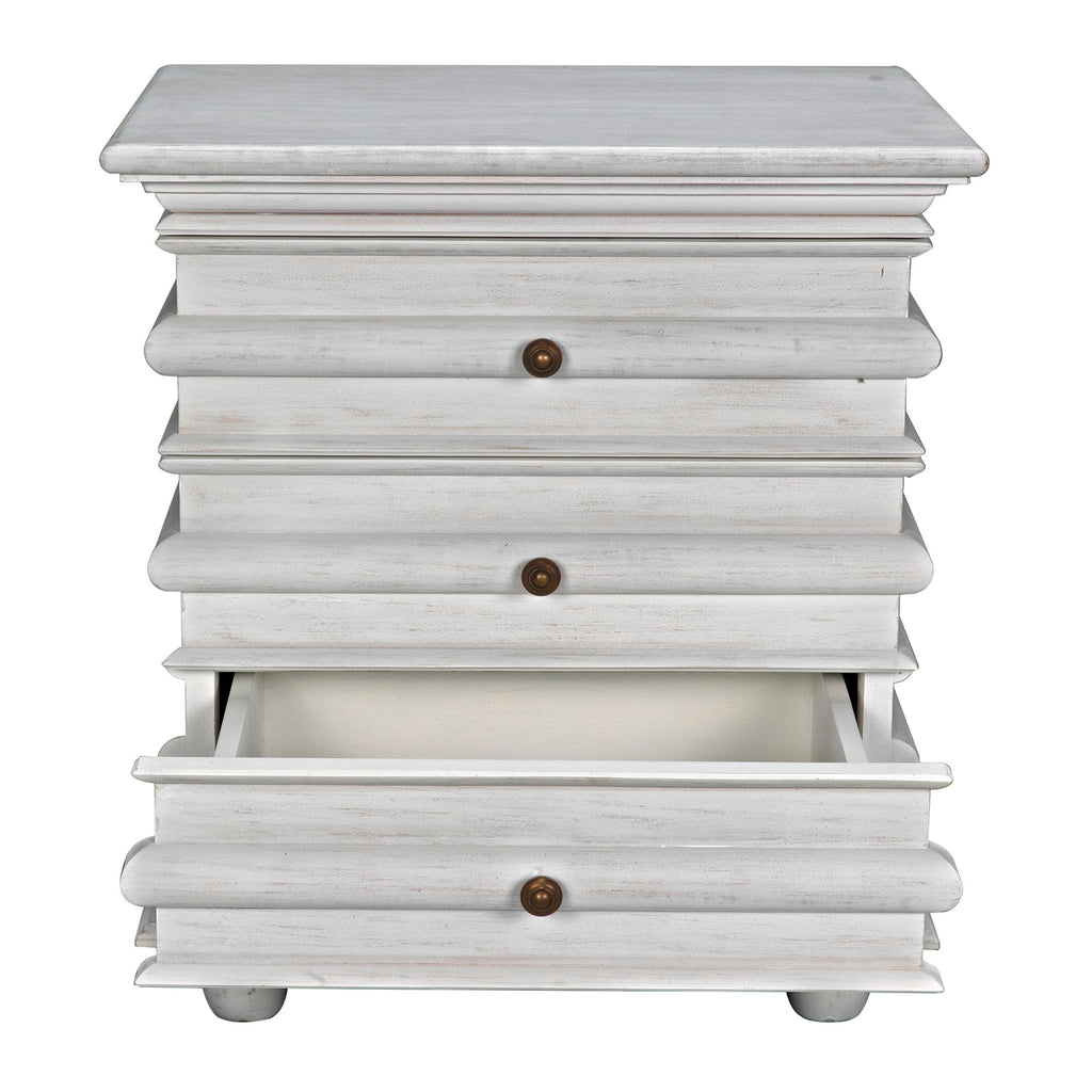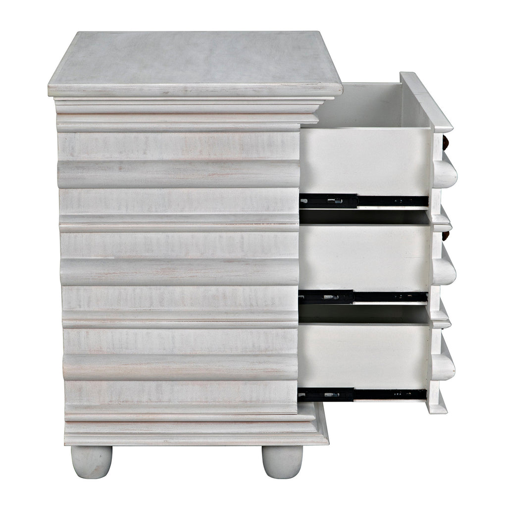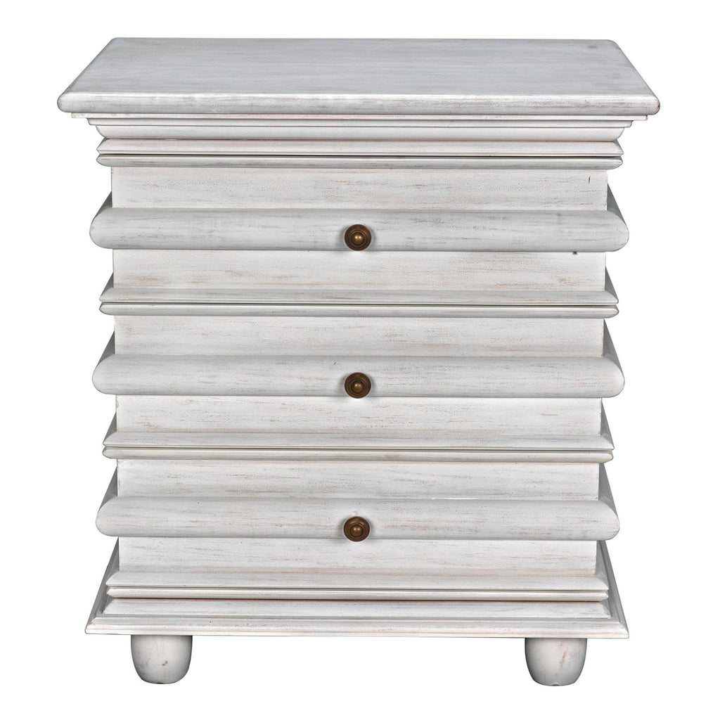 This elegant Noir table accents living rooms and bedrooms with contemporary function. Versatile to match a variety of aesthetics, this furnishing adds style to any space. With a design inspired by the jacket of a classic first edition, this handsome, handcrafted Noir Ascona side table features bun feet topped with an elaborately ribbed design. Finished in hand-rubbed stain, it has three generous drawers and coordinating hardware.