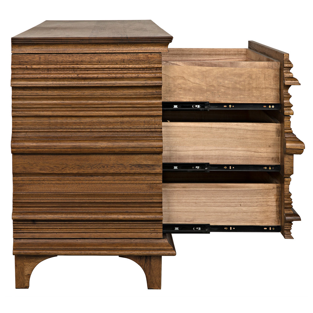 Store your everyday items in style with this contemporary dresser from Noir. Functional yet full of elegant detail, this furnishing updates any room with a bold statement. The bibliophile will love the striking resemblance to a stack of books, the aesthete will be drawn to its intricate lines, and the sophisticate will revel in its uniqueness. There is truly something for everyone in the exquisite designs in the Noir Bernard 6-drawer dresser. Solid walnut.