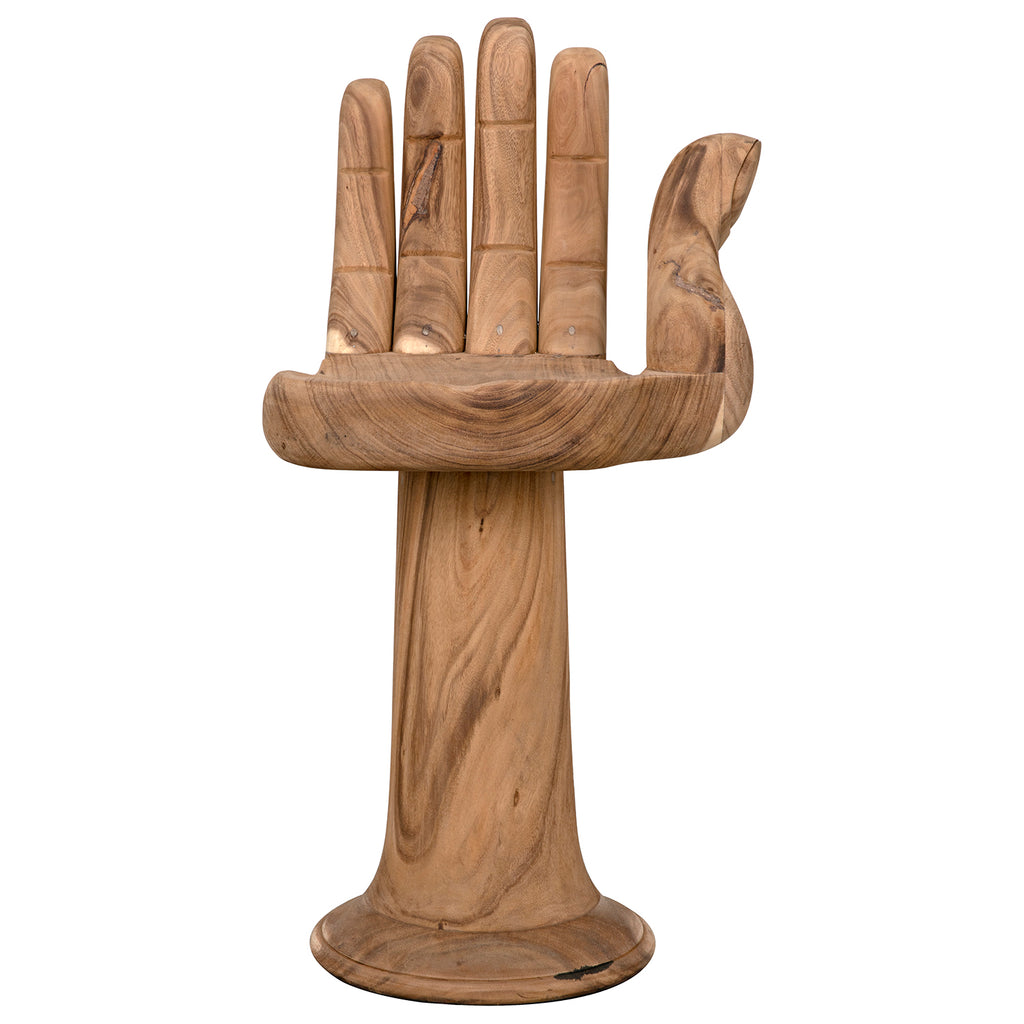 Buddha means "enlightened" and our hand-carved teak seating embodies this goal. A literal representation of the protection asana (pose), the raised, open hand symbolizes a shield, signifying courage and offering protection from fear, delusion, and anger. Here, the dynamic grains and varying tones of teak wood are highlighted in a hand carved stool, available in both counter and bar heights.