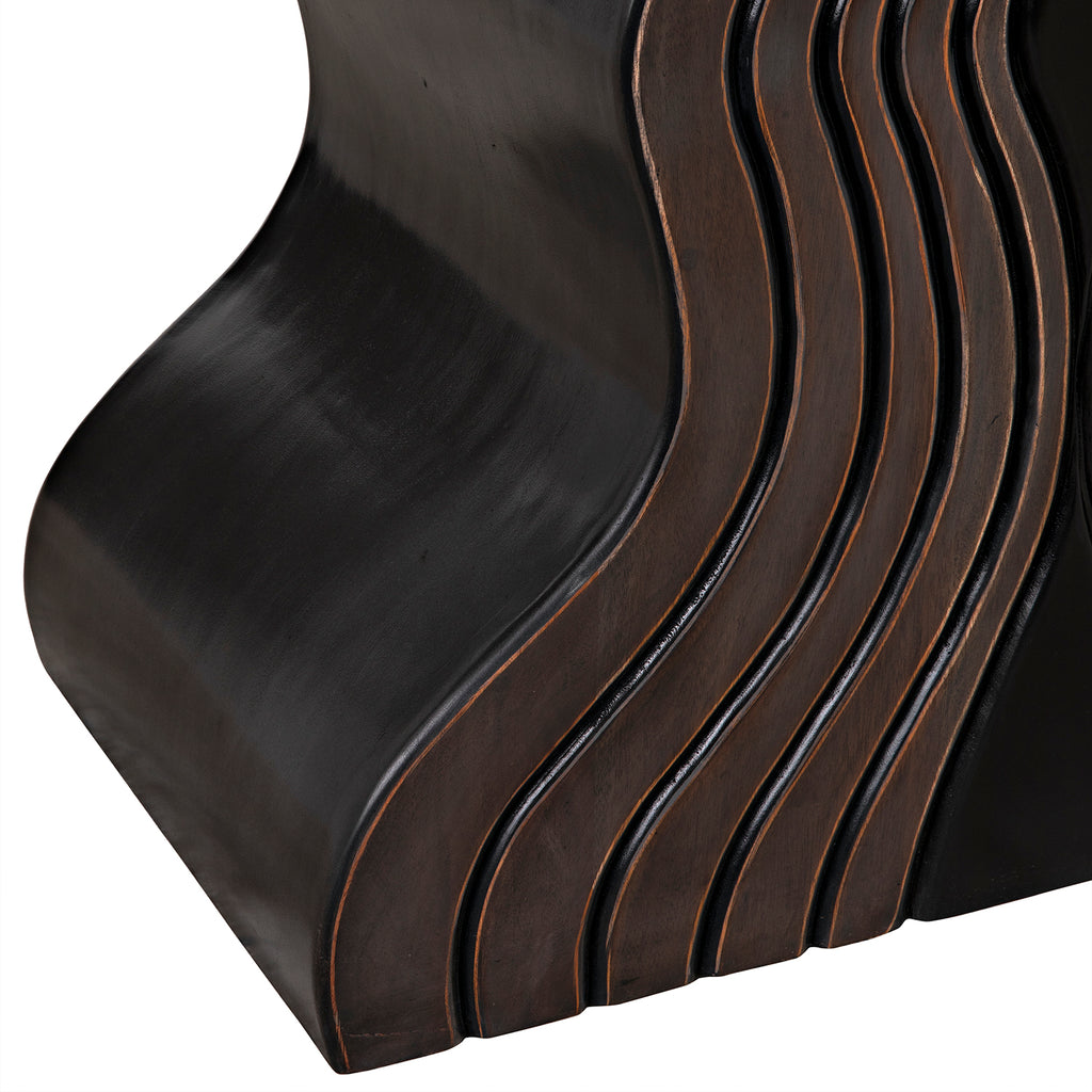 Undulating carvings that recollect open hands and old growth forests cover the waved base, as well as the edges of the rectangular top, of this unique console. Crafted of mahogany, the wood is finished with Noir's rich Pale finish and given light brown highlights that accentuate its sweeping lines.