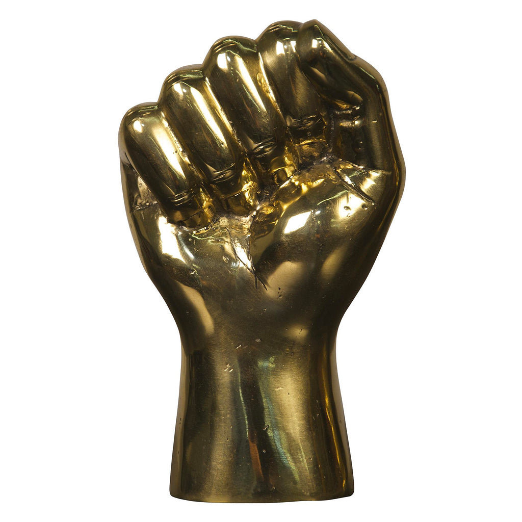 A closed fist, raised proudly, is rendered simply in an expertly weathered warm antique finish. Featuring raw, stylized lines, this Noir intriguing brass sculpture is the perfect piece to add interest to any modern decor. Handcrafted of brass, no two will be identical.