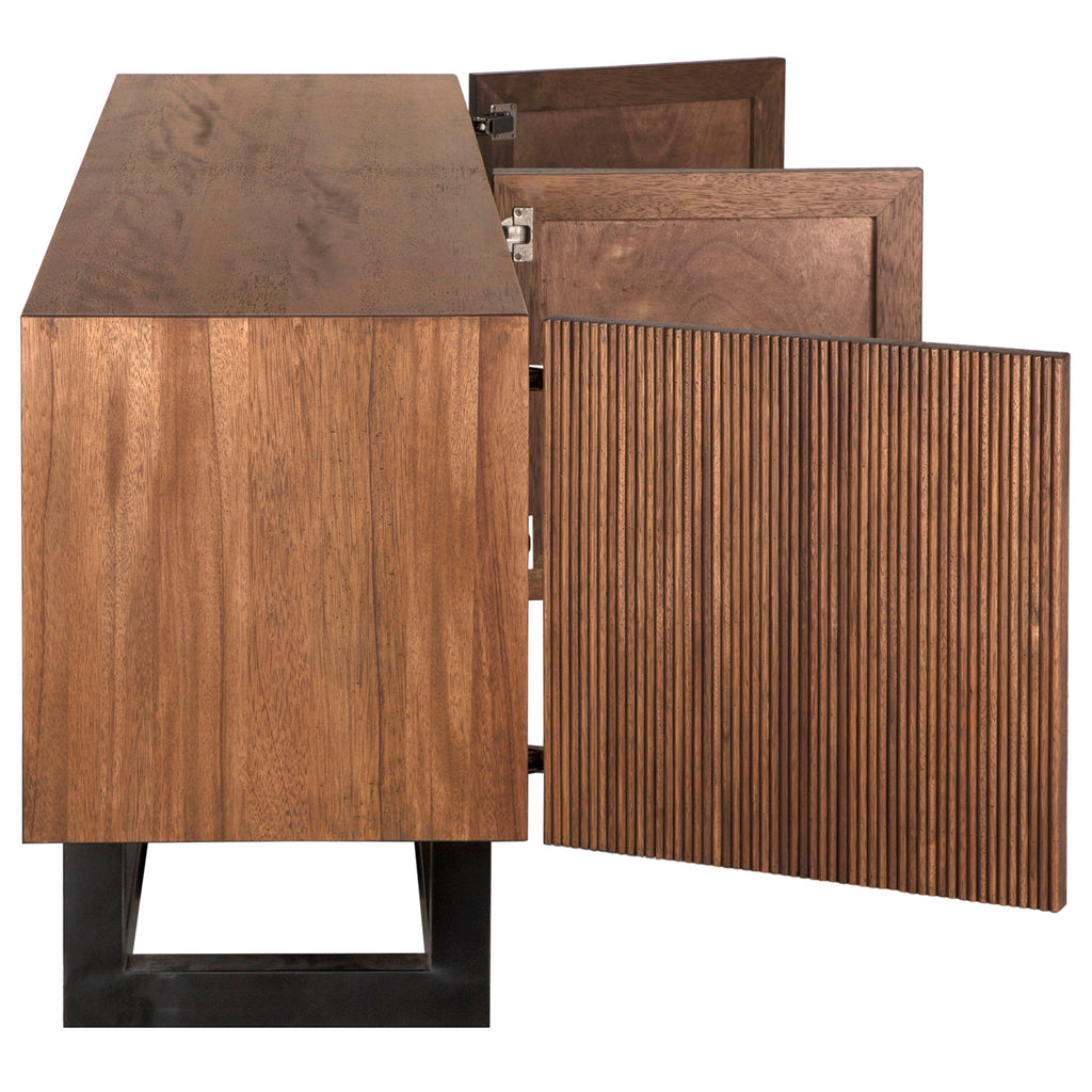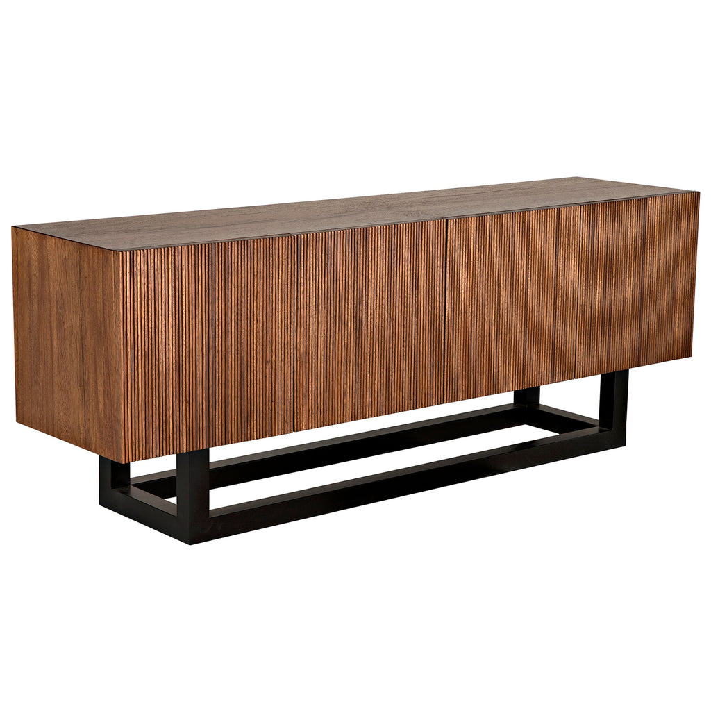 Crafted from premium walnut wood and veneer, complemented by industrial-grade steel accents, the Noir Thomson Sideboard exudes sophistication and durability. Its rich dark walnut finish, paired with matte black steel elements, creates a captivating contrast that enhances any room's ambiance.