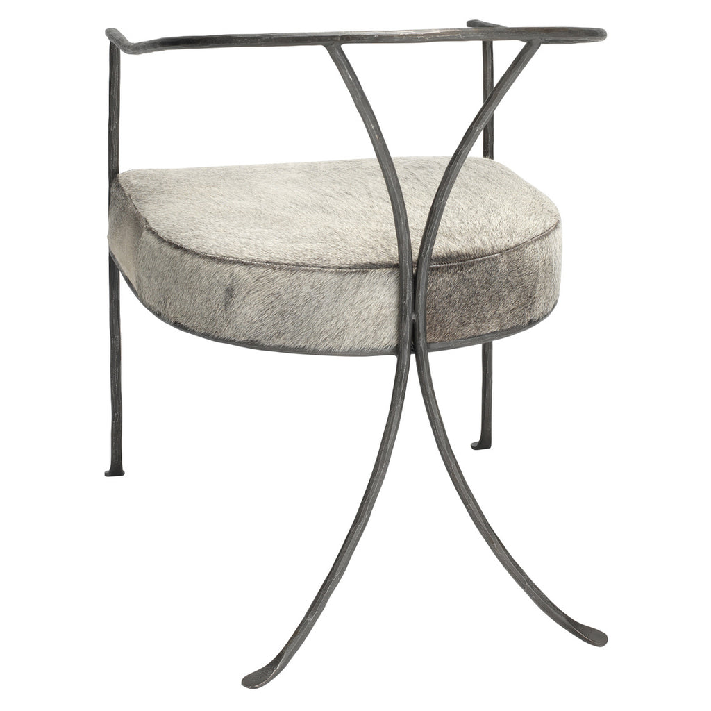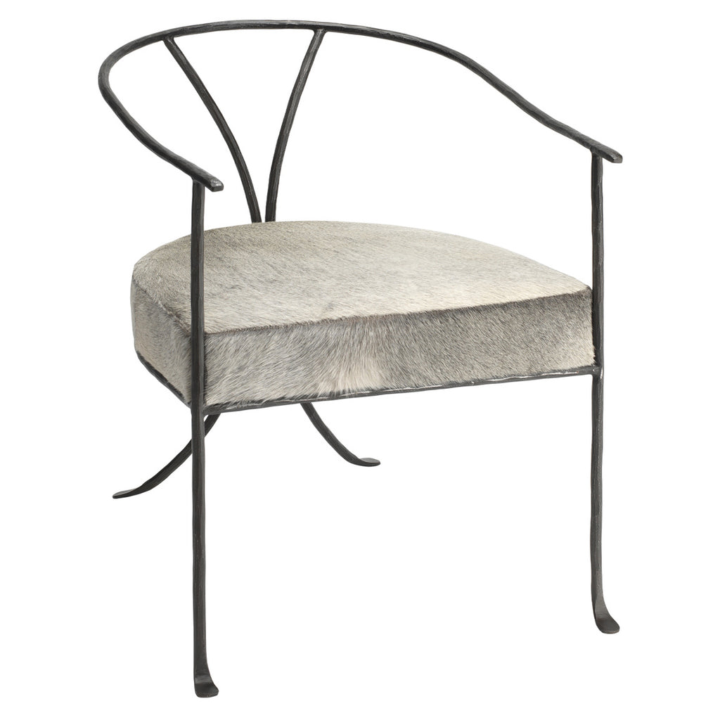 The Kai collection features dynamically swooped hand-forged iron legs, with a delicacy unexpected from such a substantial material. The seating is topped with thick cushions of grey hair-on-hide, and the tables with strong tempered glass. Unexpectedly combining grace and strength, they make a striking addition an industrial, rustic, or eclectic home.