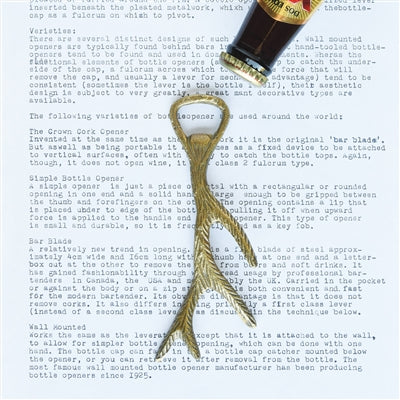 A classic article of daily use transformed into a fun way to pop the top of your favorite bottle. Cast of iron and plated in brass.