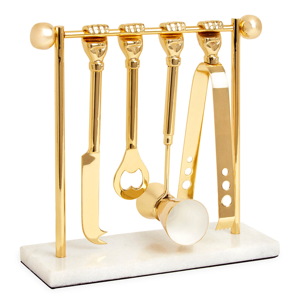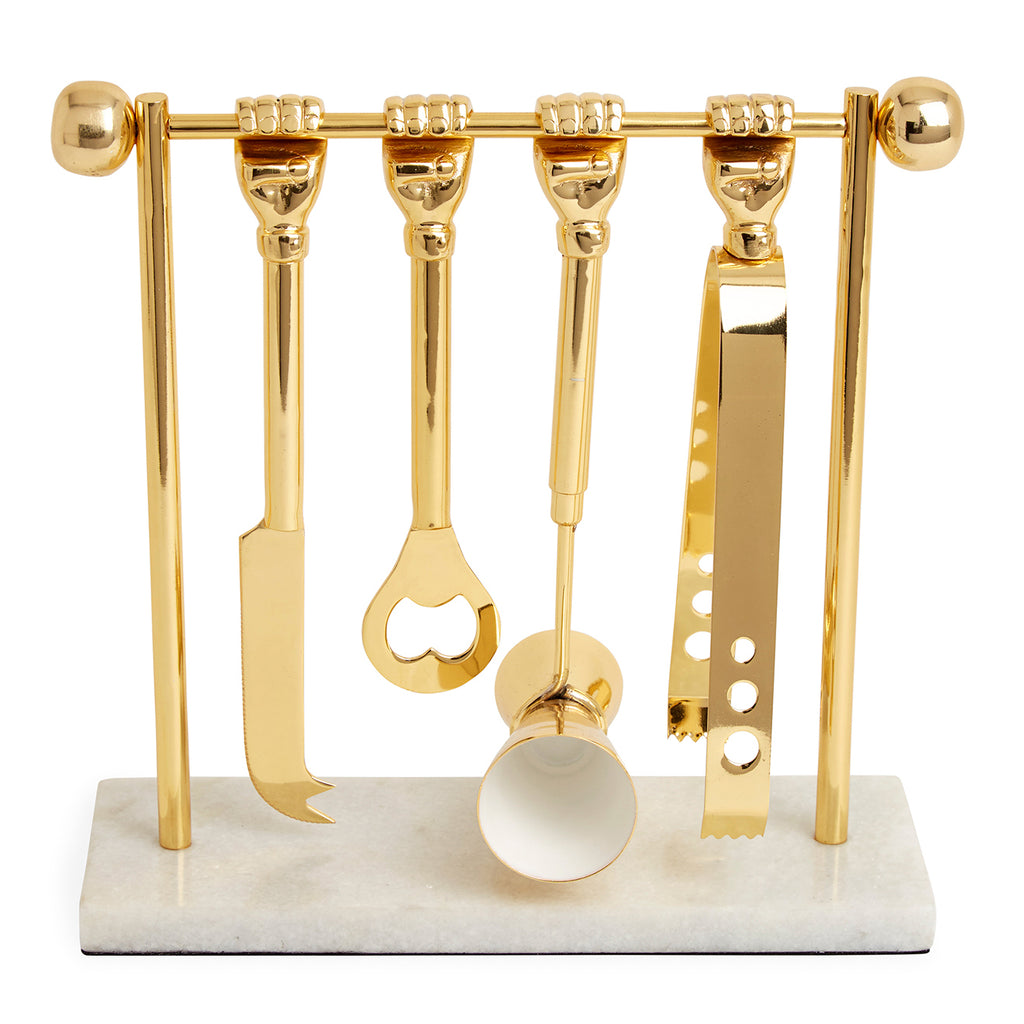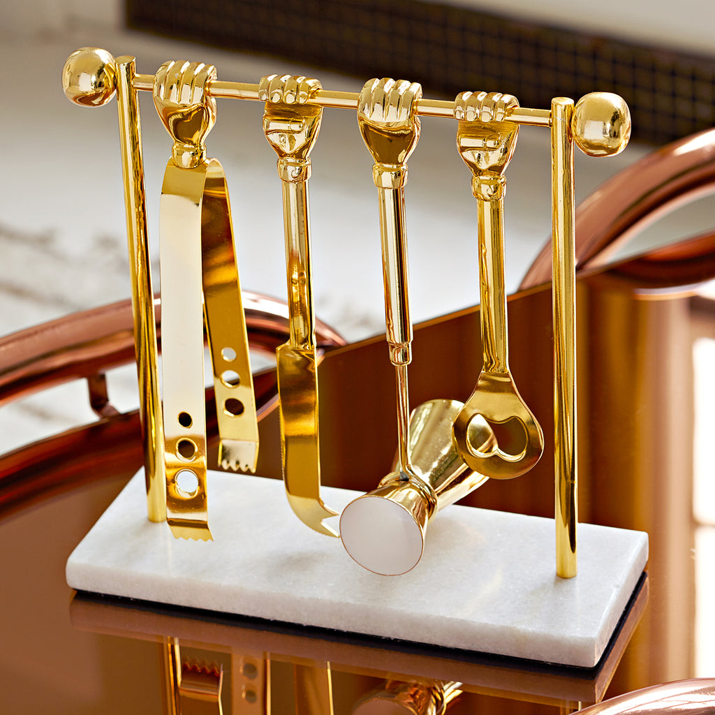 The perfect drink takes proper training. Inspired by the original workout gear—classic barbells—the Jonathan Adler brass bar tools latch onto a solid brass dumbbell elevated on a marble base. Includes ice tongs, a bottle opener, a double jigger, and a knife—each tool is finished with food-safe lacquer. Like a fine wine or your favorite leather jacket, our brass only gets better with age. Over time, the polished brass will develop a rich natural patina. If desired, use a microfiber cloth to buff out fingerprints. If you have no patience for patina, use a brass polish, but take care to avoid any non-brass detailing or inlays.