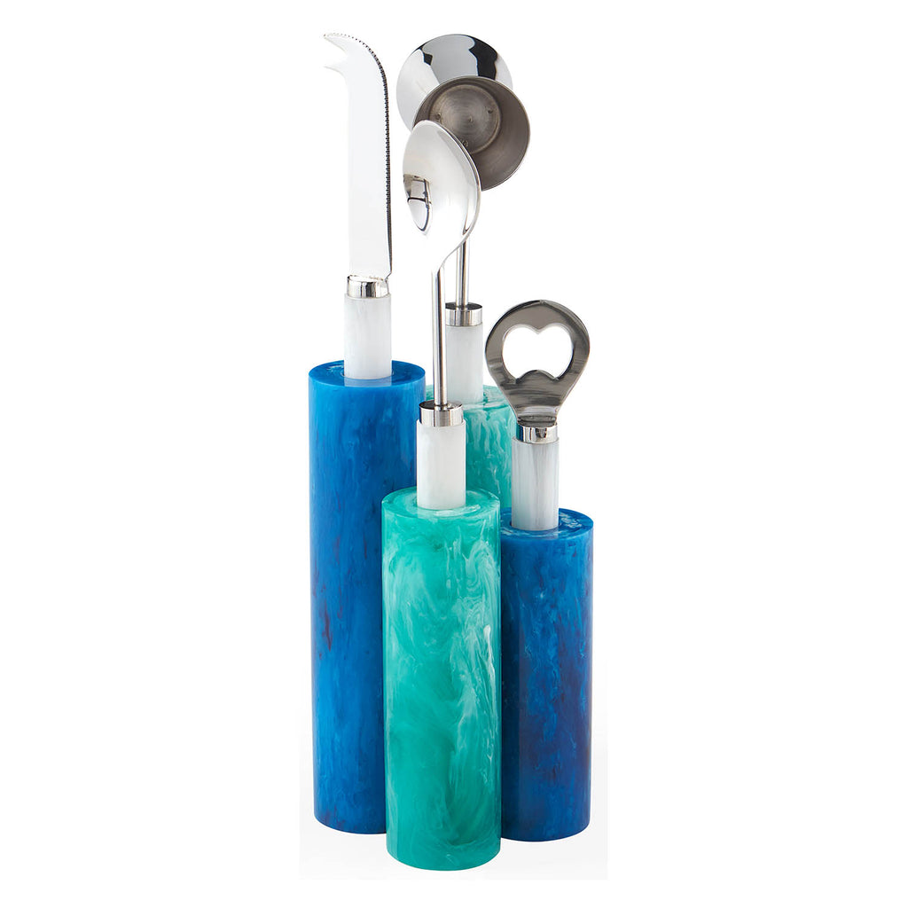 The Jonathan Adler marbleized Mustique Barware Set brings one-of-a-kind shine to your next cocktail hour. Featuring a tonal blue stand that holds four stainless steel bar tools with white acrylic handles. All acrylic is hand-poured and polished to luminous perfection. Set includes a spoon, a bottle opener, a double jigger, and a knife.