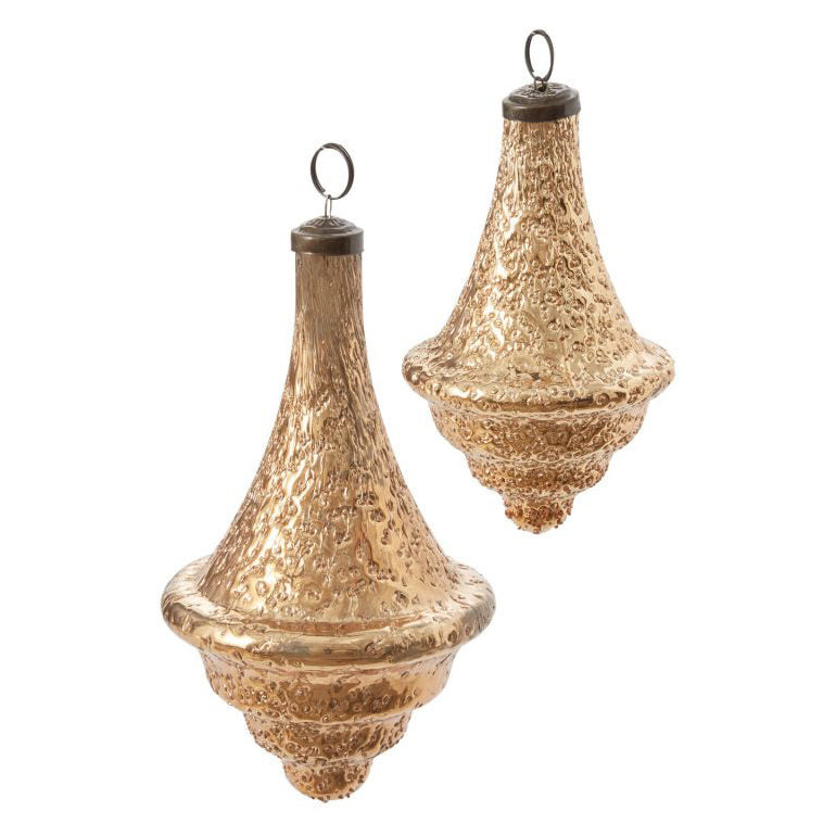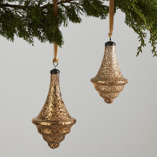 Bring home a classic holiday accent with the large glass & iron, finial-shaped Dimpled Ornament. Featuring a textured gold finish, this ornament has a long-lasting, heirloom quality & adds a festive glam to the Christmas tree.