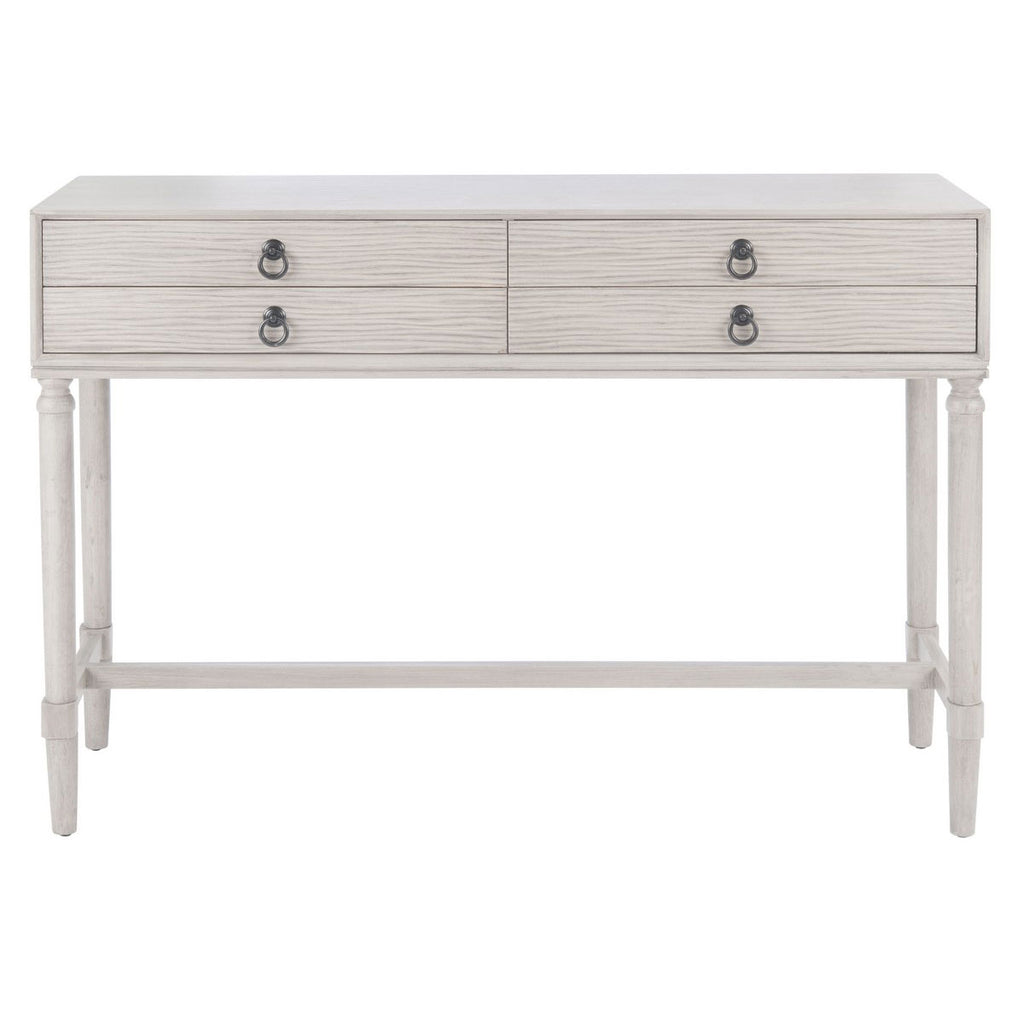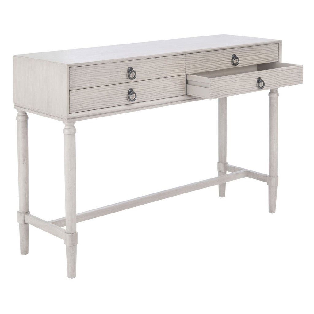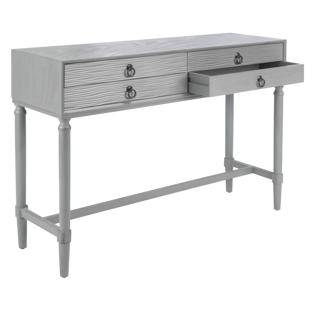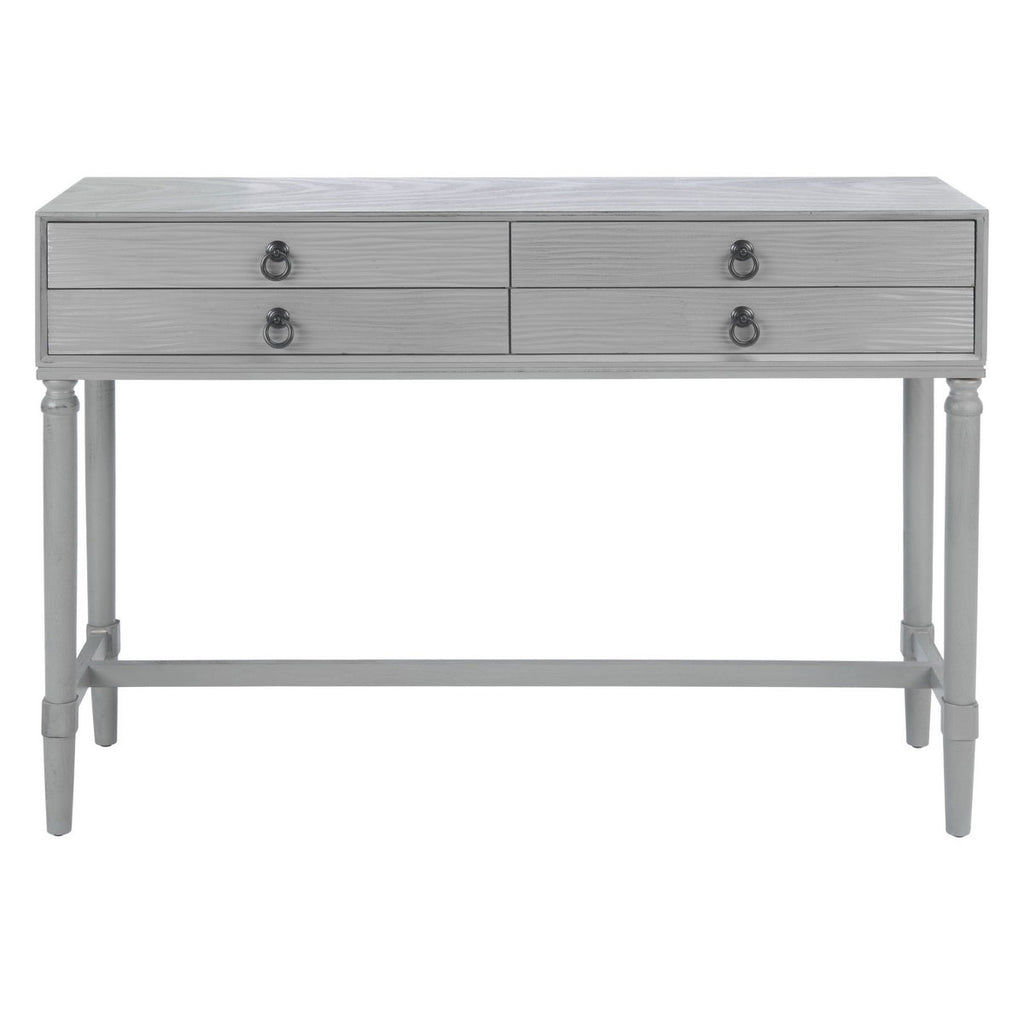 Rustic meets refined in this superb 4-drawer console table. Drawing inspiration from the timeless elegance of French country living along the Riviera, the finely carved accent details are beautifully highlighted by a distressed grey finish.