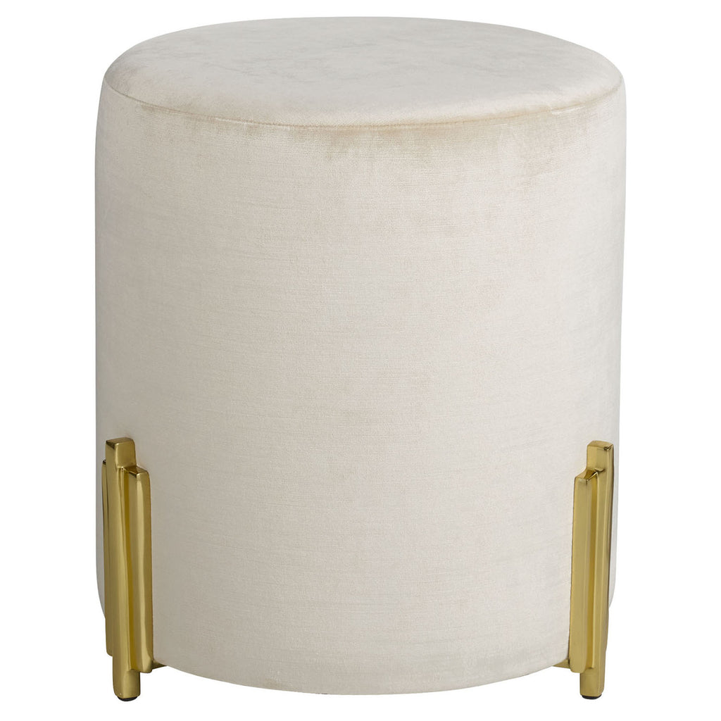 An Art Deco–inspired drum-style ottoman upholstered in sterling velvet atop a polished brass base; luxe and perfectly sized for dramatic impact. Finish will vary.