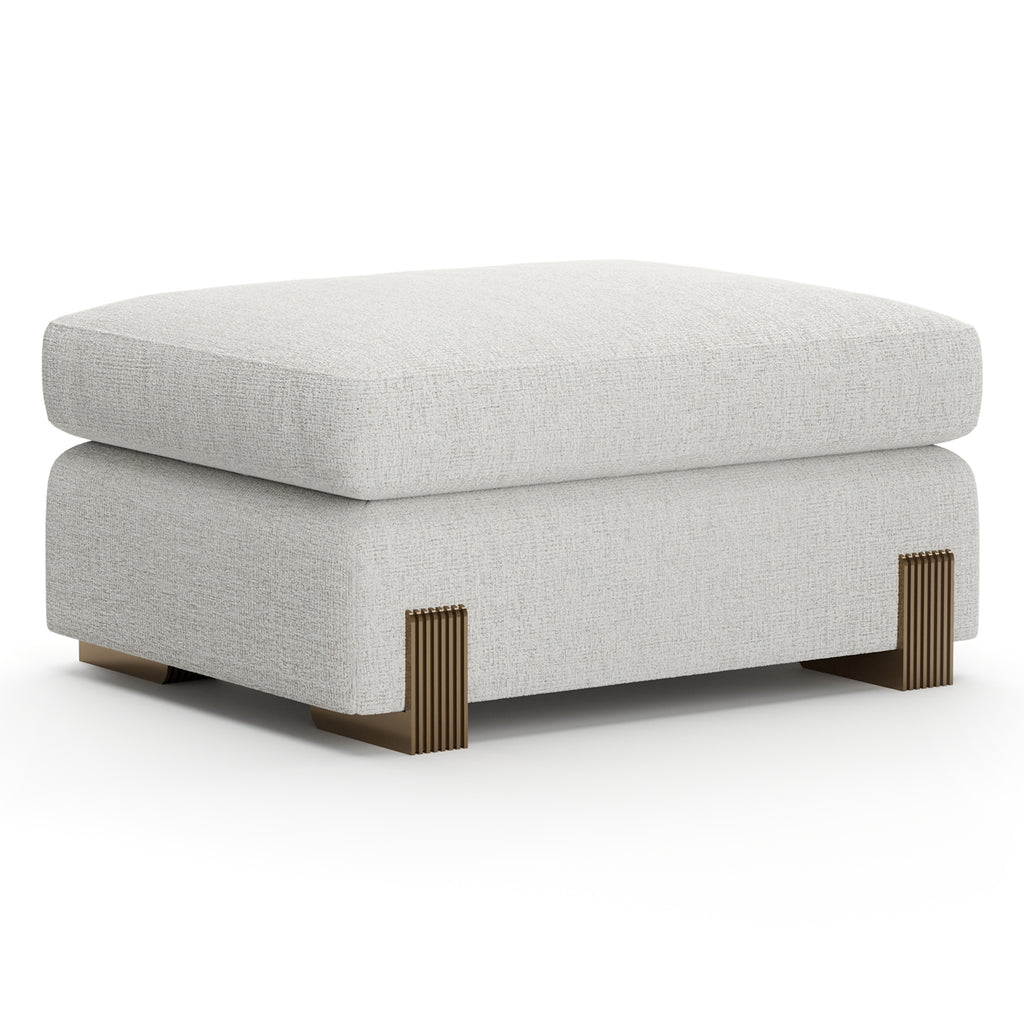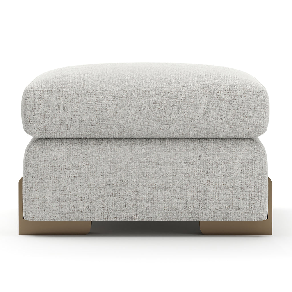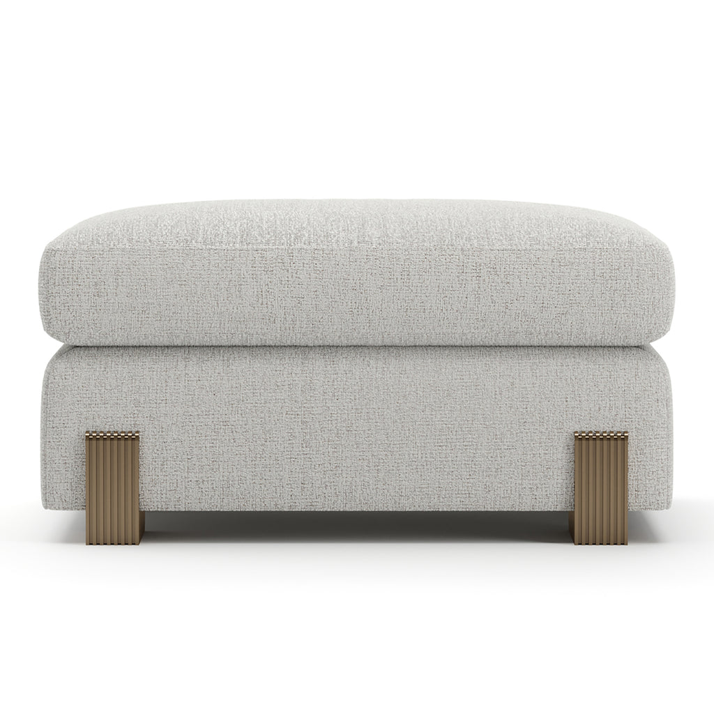 Elevate your comfort and style with the Counter Balance Ottoman in oatmeal melange woven fabric with subtle rust threading. Brushed Gold metal legs provide the perfect accent, blending sophisticated luxury and inviting comfort.