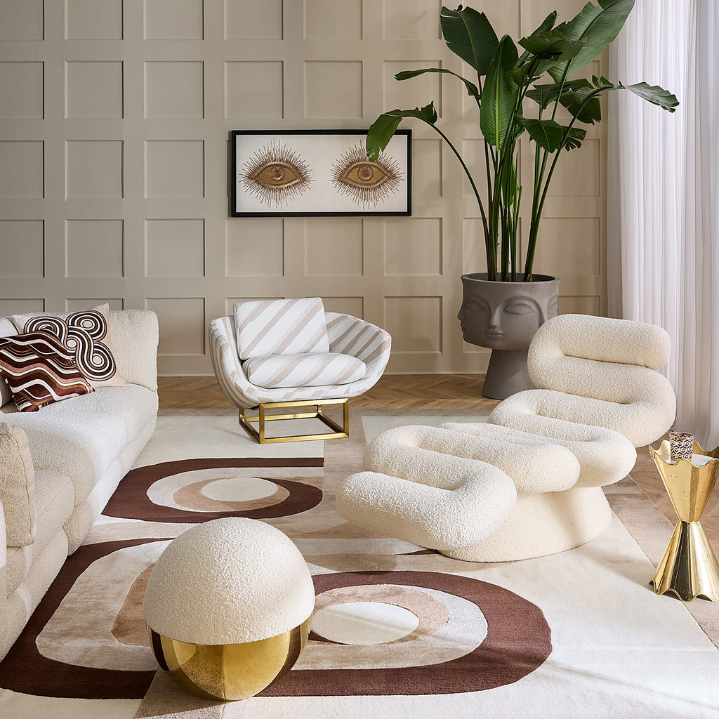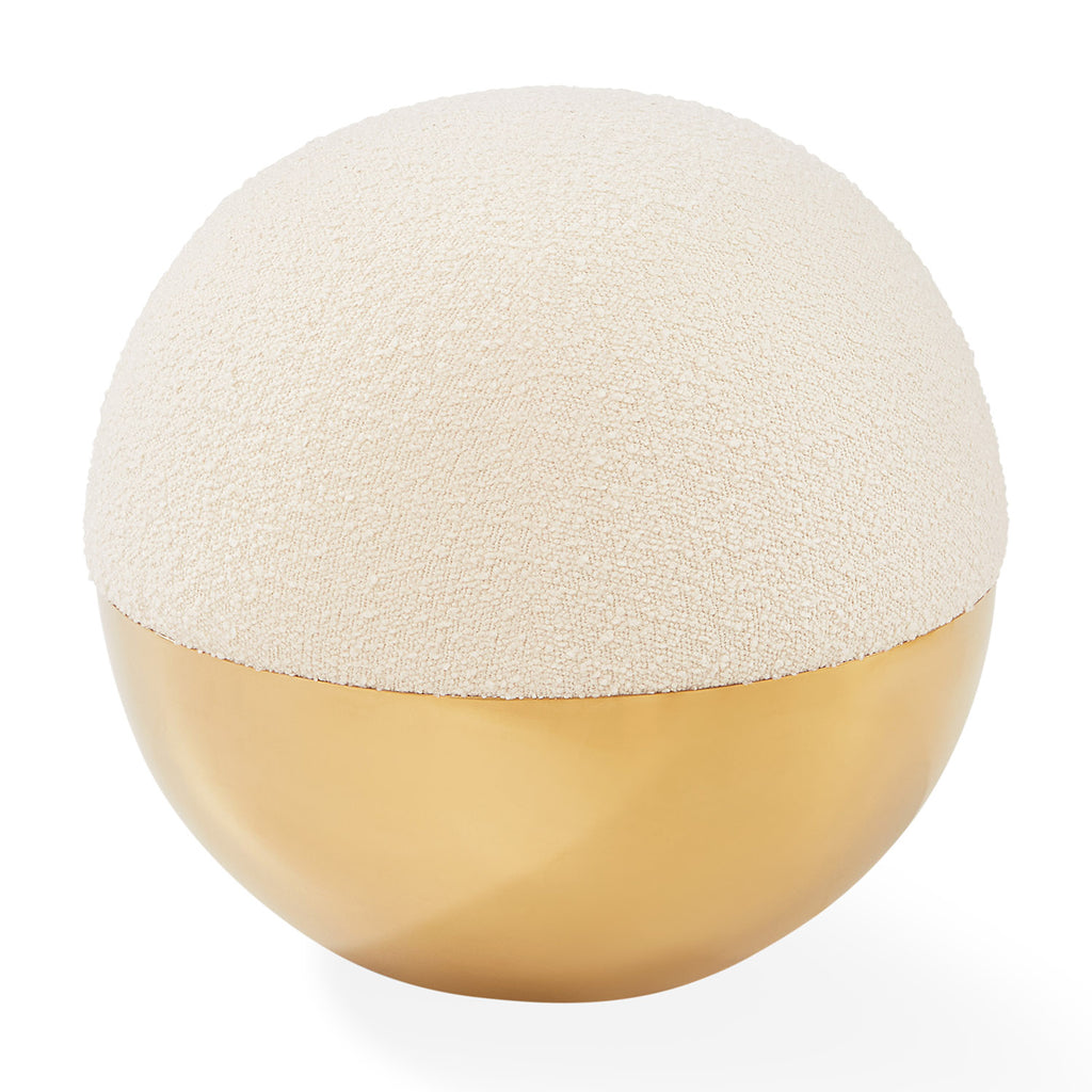 Minimalist and modern, a simple dot to punctuate your place: A honed brass base topped with an upholstered top. A comfy and surprising seating solution available in your choice of electric Cirrus Cobalt or bright Olympus Ivory bouclé.