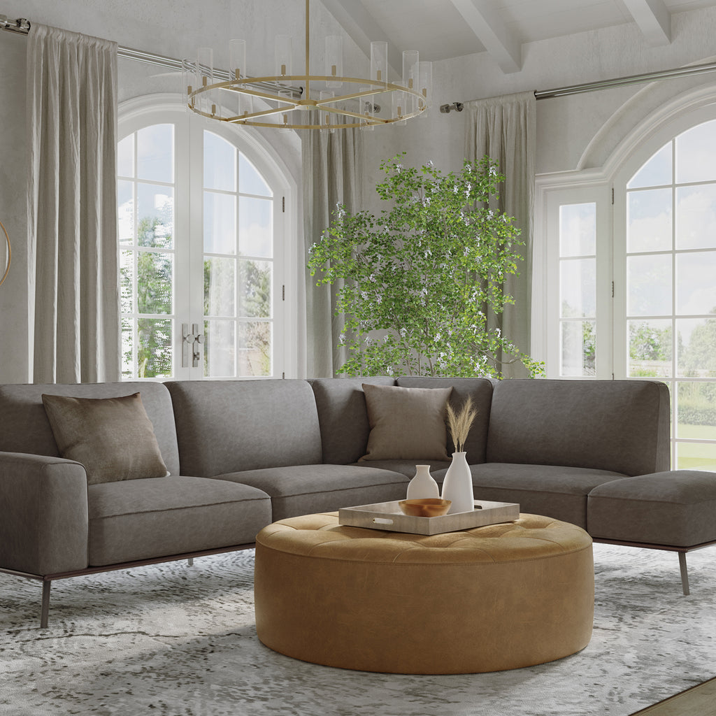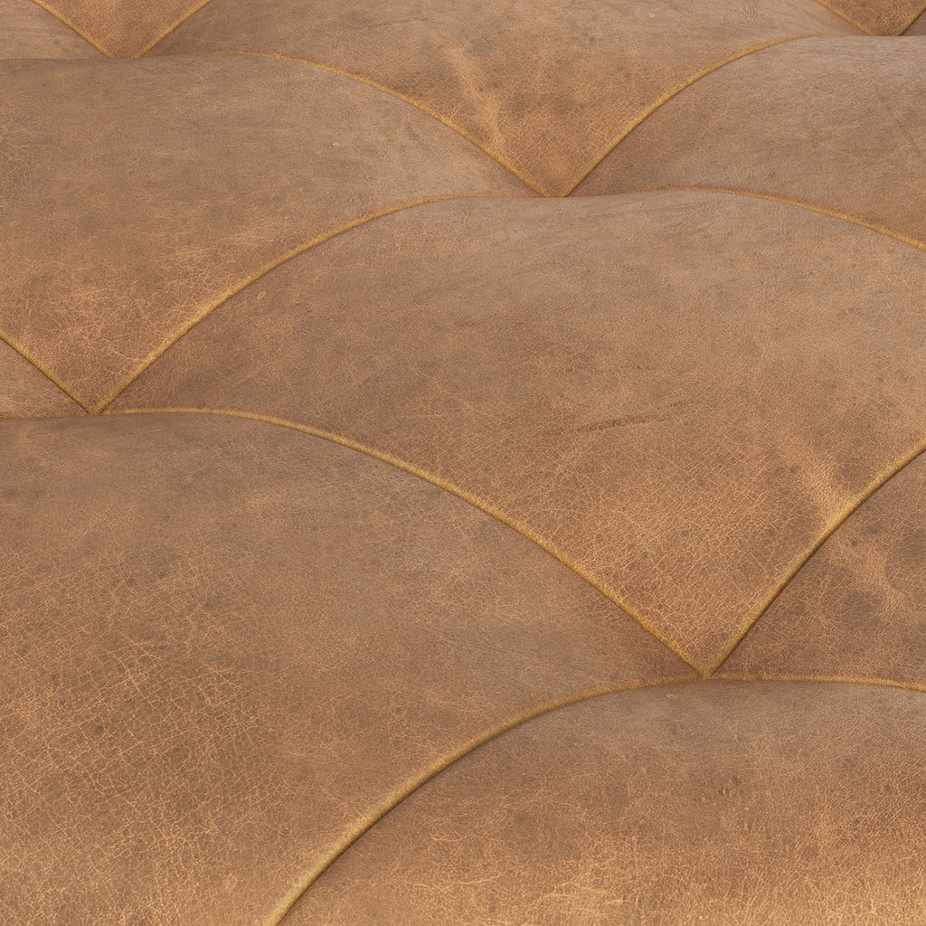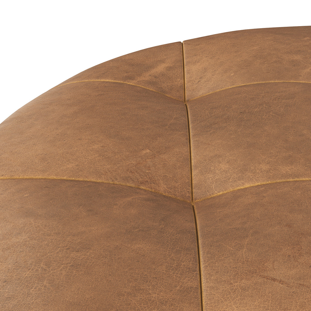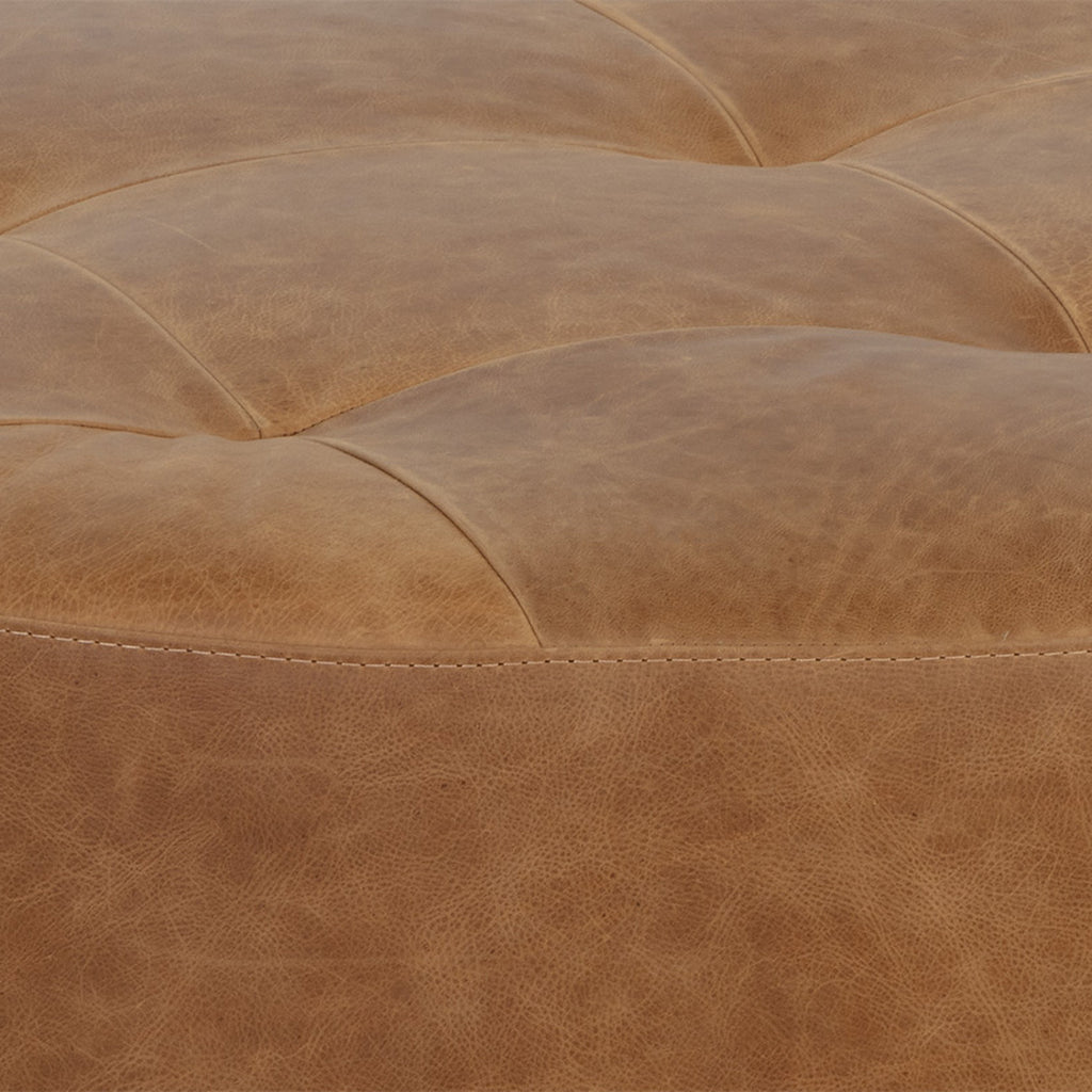 A classic, Italian-made round ottoman that features subtle tufting on the top for a gorgeous touch of style. Upholstered in our camel 100% Italian bovine leather for lasting quality. This rich, thoroughly dyed leather features a full grain finish with natural oils and waxes that accentuate the beautiful characteristics of the hide. Finished with a solid beech wood base.