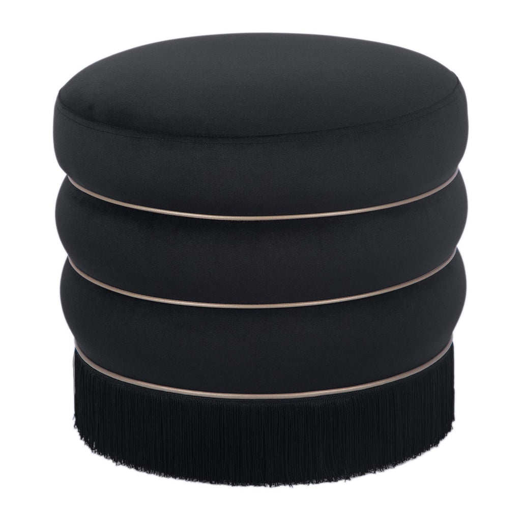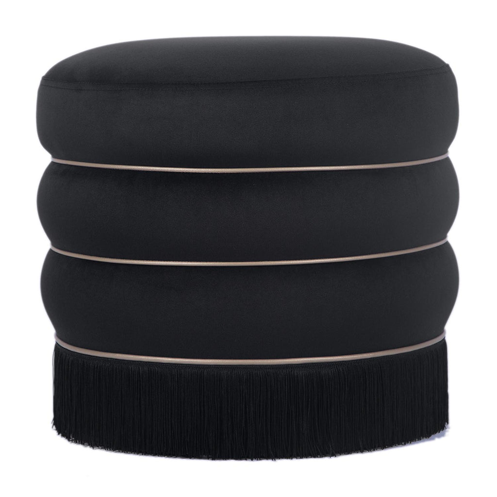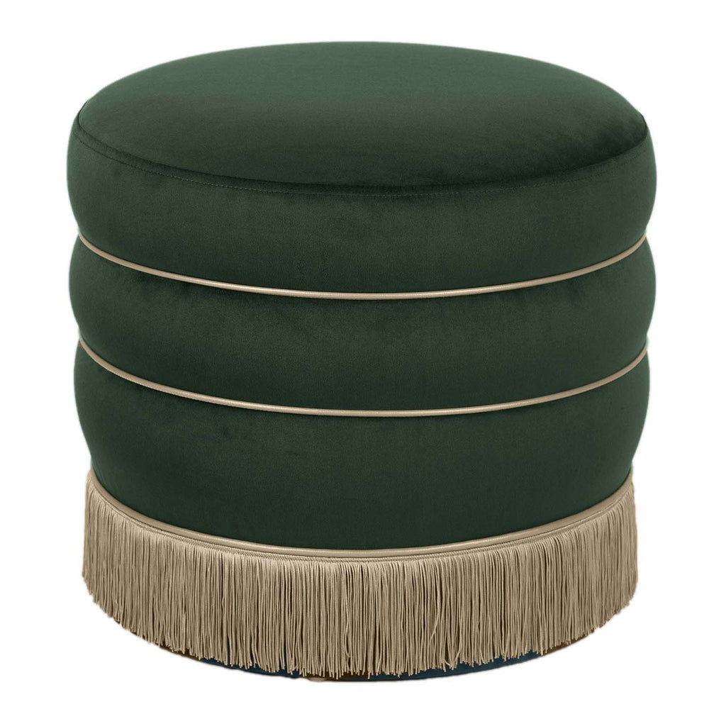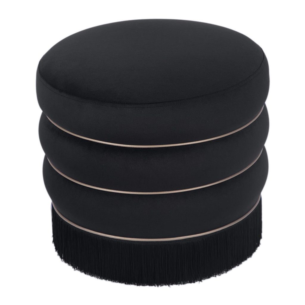 Retro meets modern with the Lakka ottoman. This intricately designed ottoman features luxurious velvet upholstery and vegan leather piping while its tasseled base completes the look.