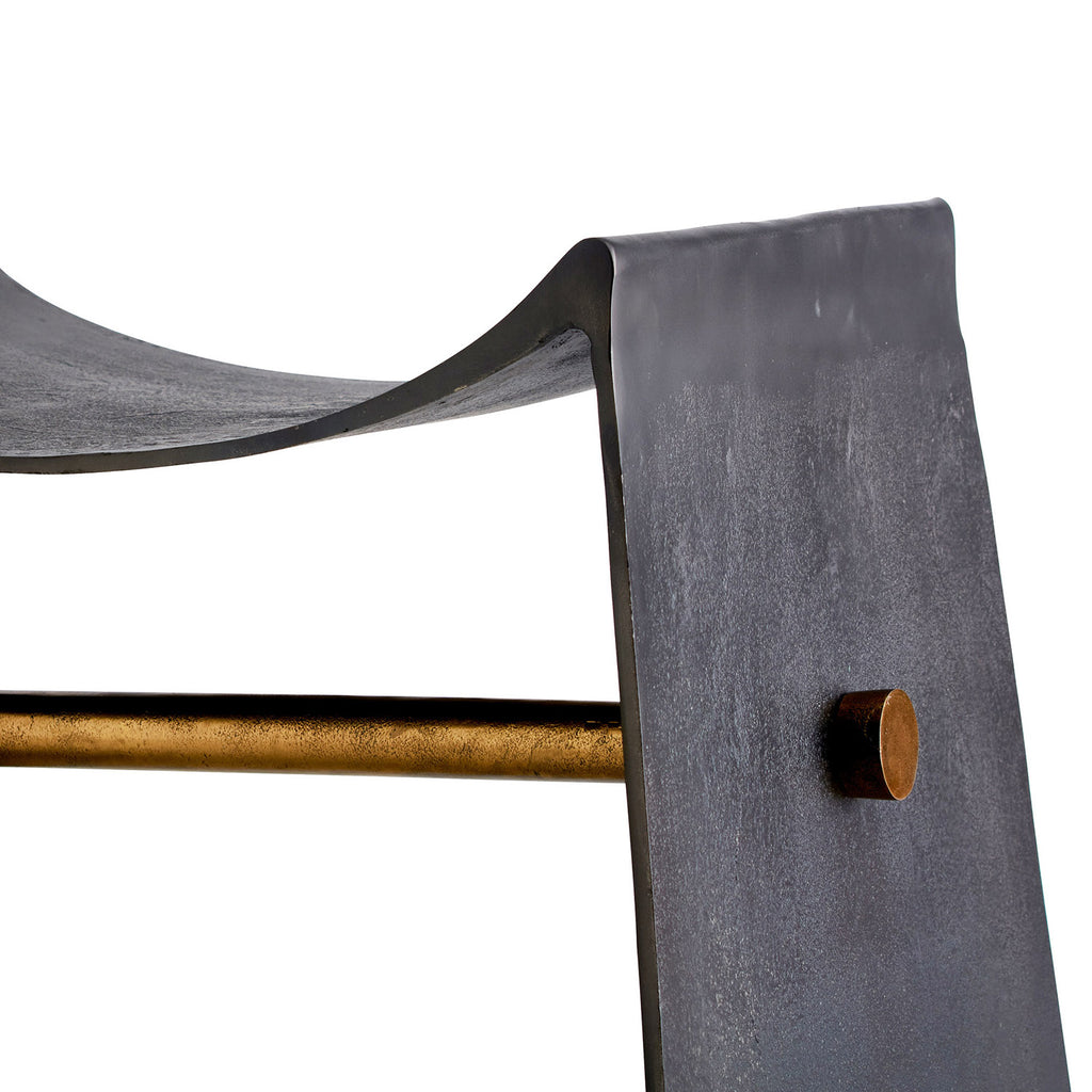 A conceptually industrial seating piece, the Montez stool features a sling-like blackened iron seat flowing into sled-style legs as one continuous form—curved for comfort. Finish will vary.
