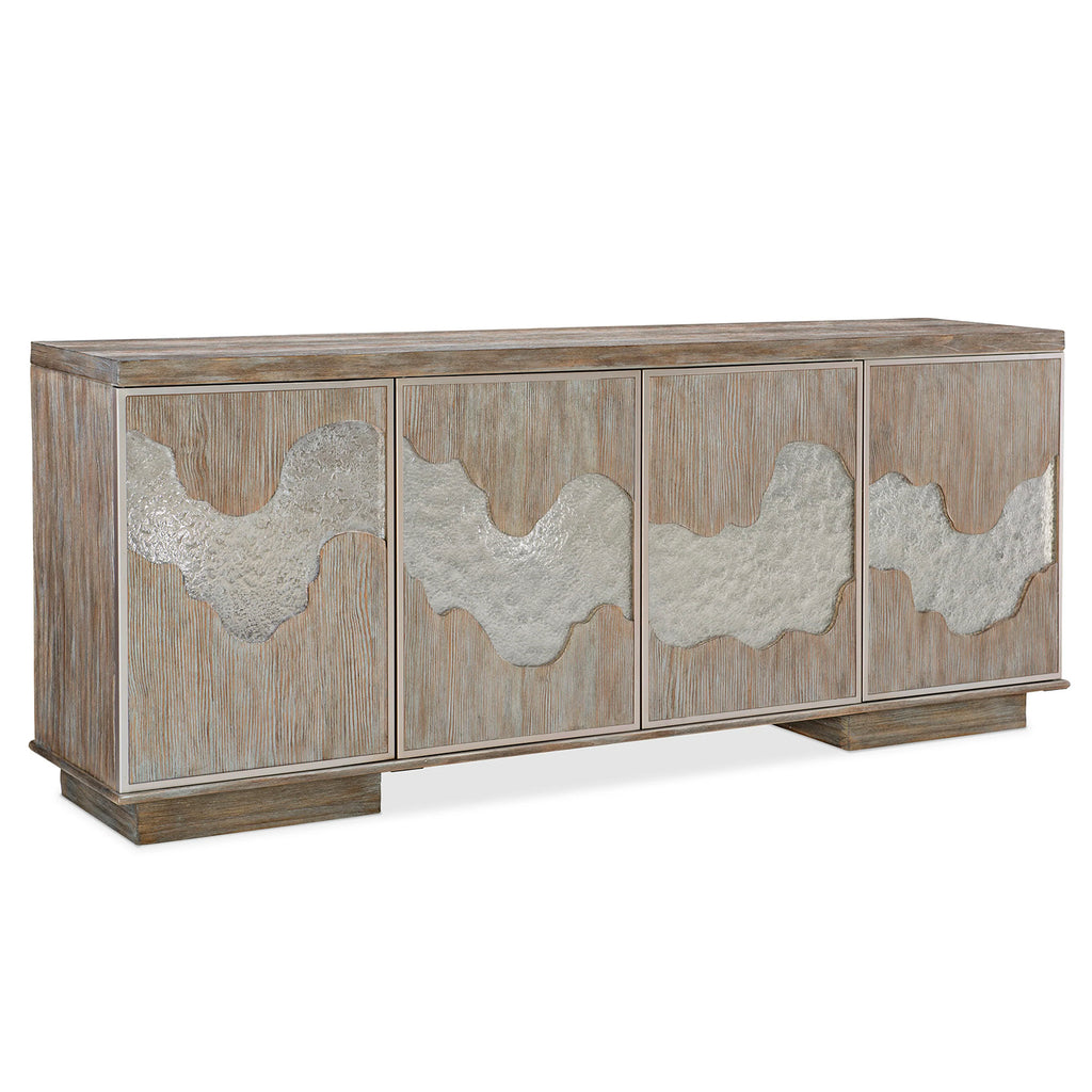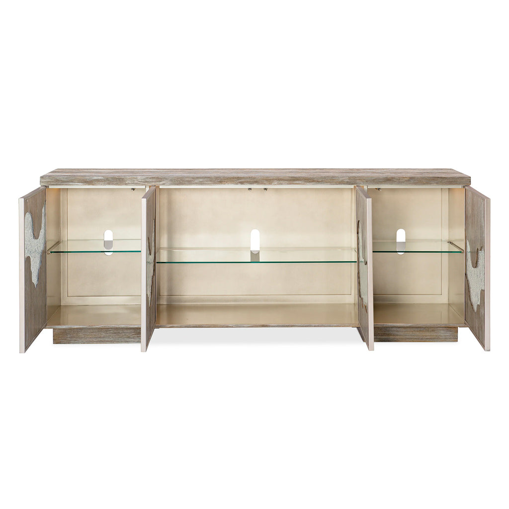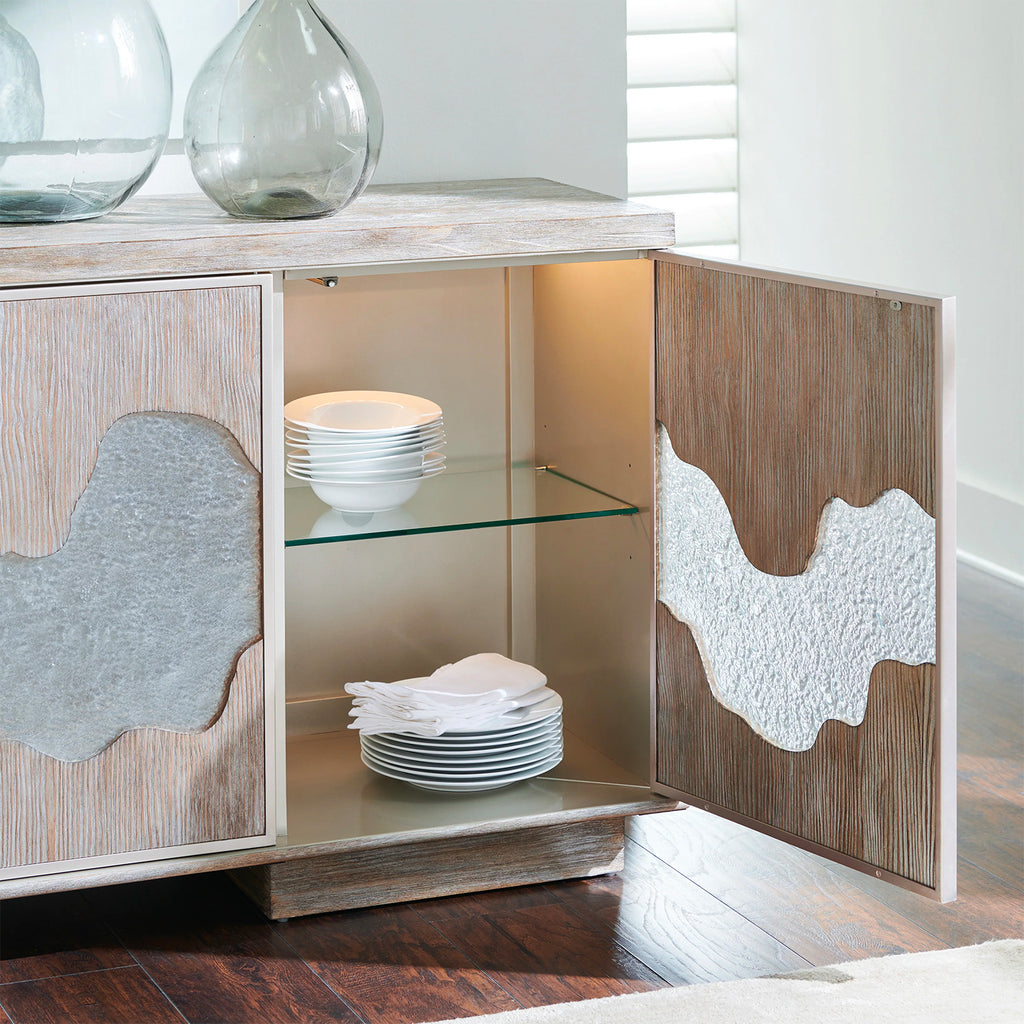 Connecting land and sea, this one-of-a-kind case piece lends substantial style to a space with its unexpected mix of materials and motifs. Crafted of wood veneers finished in Driftwood, it features four doors with individual, custom-cast glass panels that are lightly shaded from behind to create a frosted effect and framed in a Neutral Metallic finish. Behind each door, you’ll find a lighted interior illuminating a Neutral Metallic finish plus adjustable glass shelves and a ventilated back panel. Creating the look of a poured-glass stream, this extraordinary case piece is destined to be the star of the room.