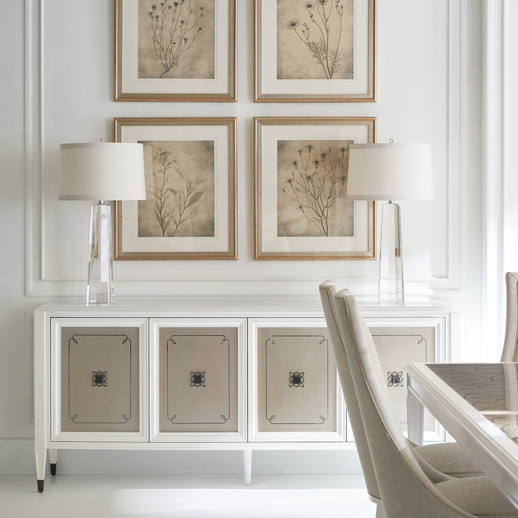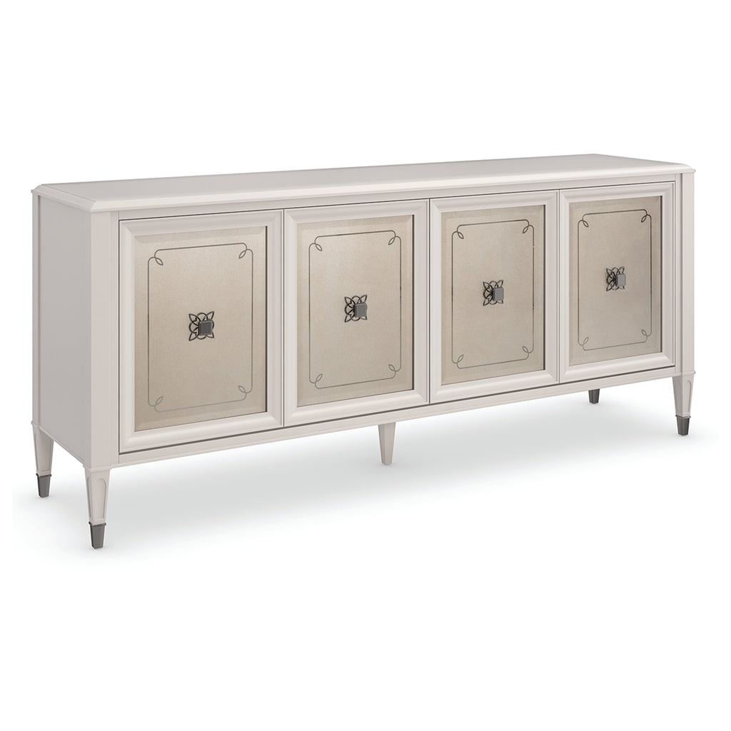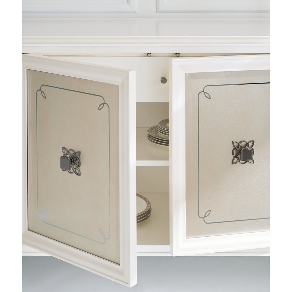 With its exquisite detailing and shimmering Stardust finish, this buffet effortlessly mixes beauty and functionality. Classic styling features mirrored door fronts with a decorative element stenciled on the back in Soft Silver paint, complemented by a quatrefoil pattern behind its custom hardware for added interest and dimension. Designed with entertaining in mind, it offers ample space on top and inside for keeping serveware, linens and other essentials.