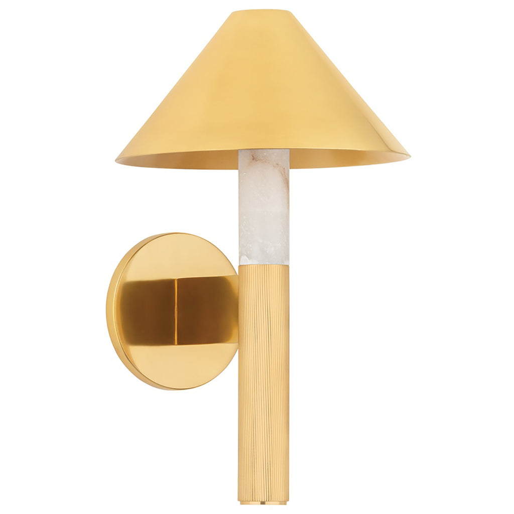Towing the line between traditional and contemporary styling, Corbett Lighting Altona makes a restrained, luxe statement. The traditional torch silhouette allows the distinctive mix of materials to shine in this versatile sconce. Juxtaposed with natural alabaster, the vertically fluted Vintage Brass detailing and matching shade results in varying light effects.
