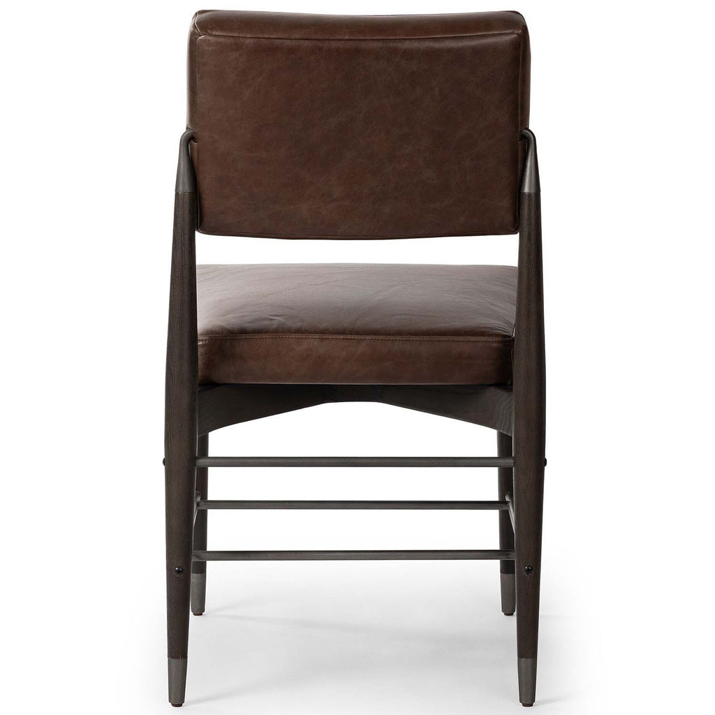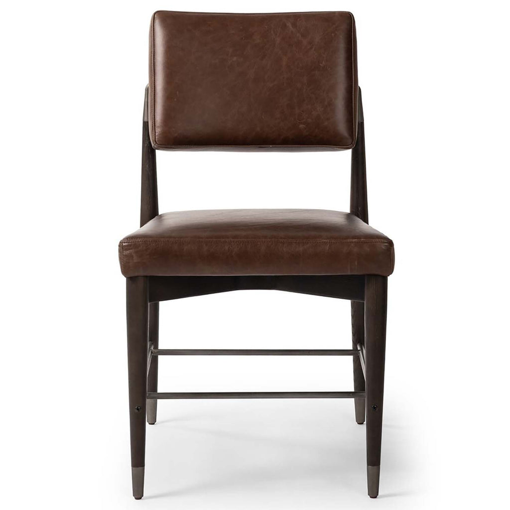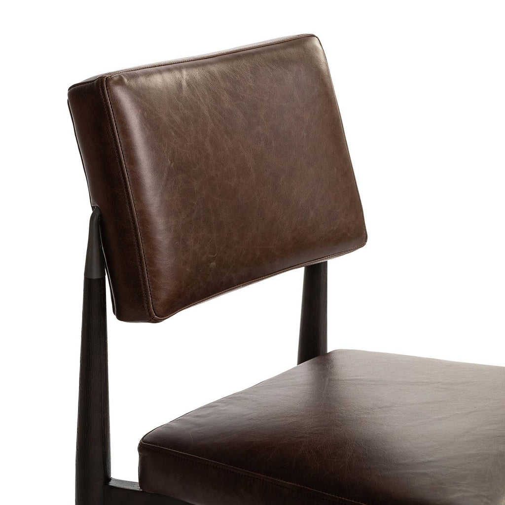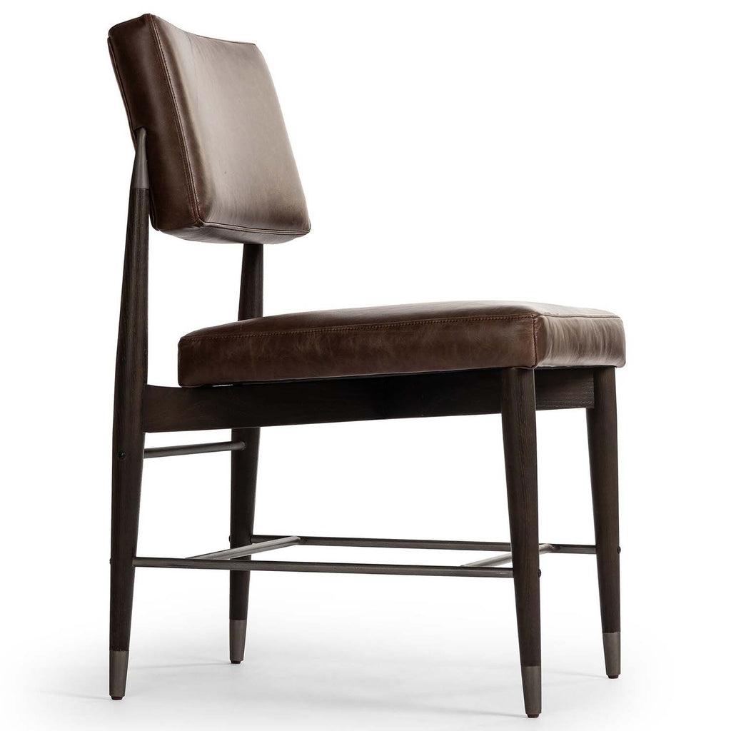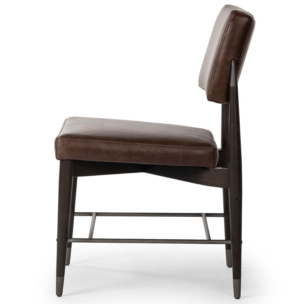 Eighties inspiration gone modern. With iron-dipped caps, tapered solid oak frames the seat and back of this armless dining style, upholstered in brown top-grain leather. Slim iron stretchers add an airy vibe.