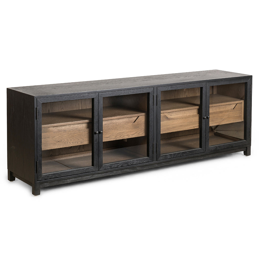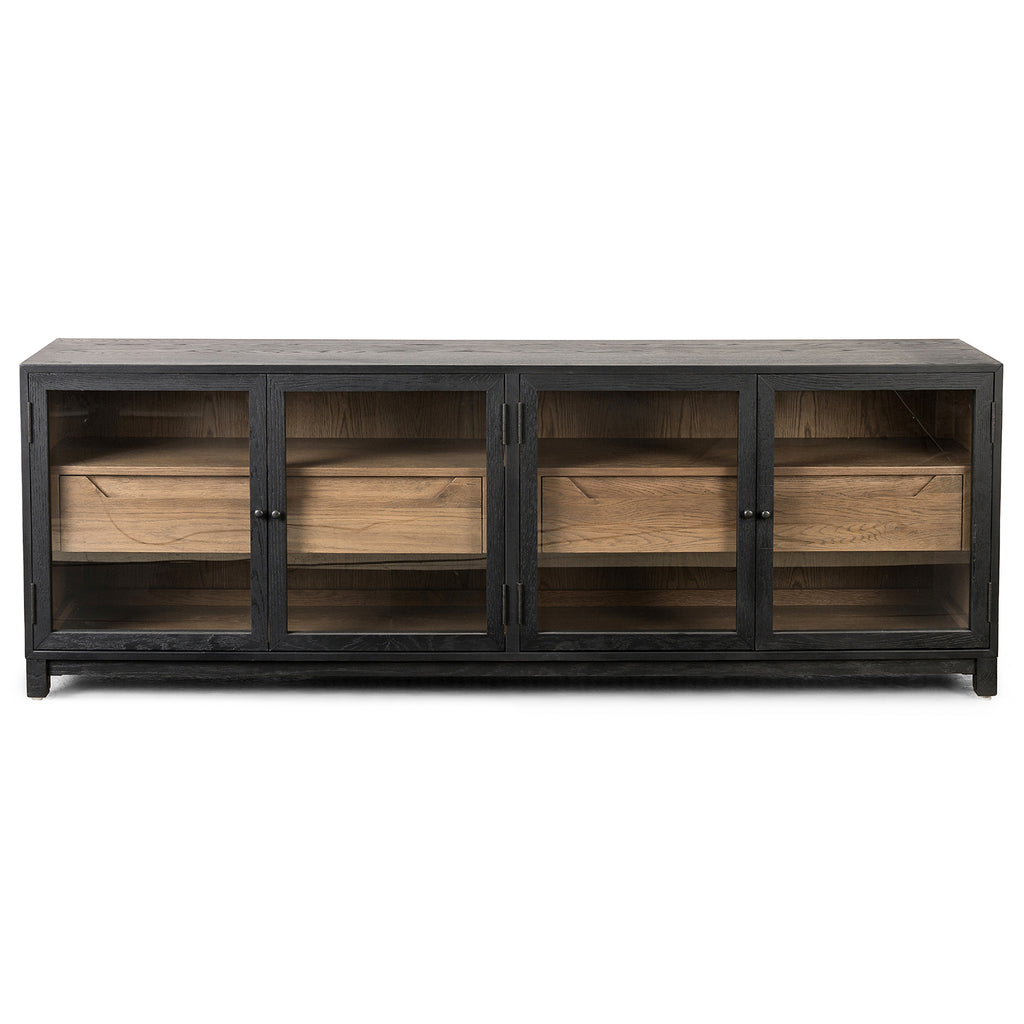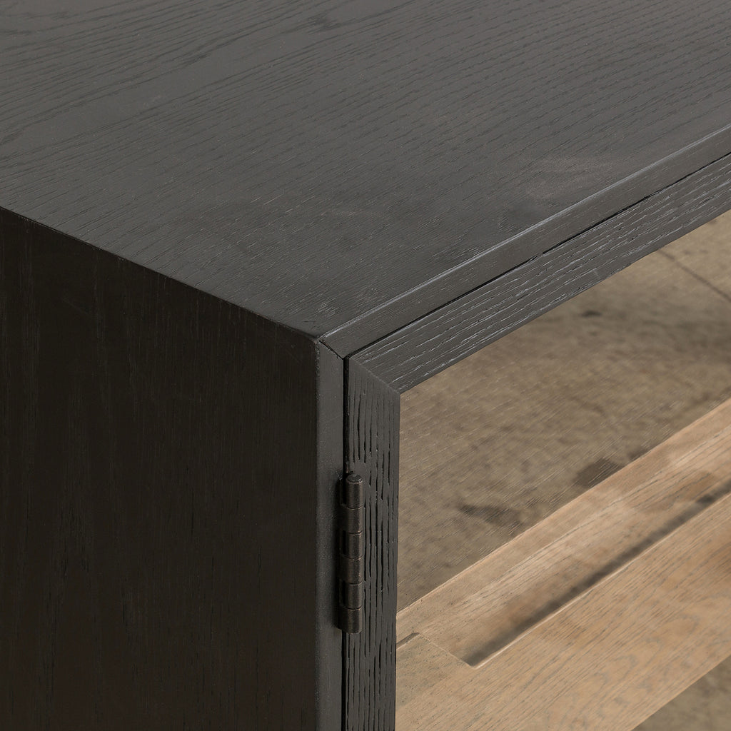 Black drifted oak encases light interior shelving for subtle but striking contrast. Glass doors allow for prized possessions to dazzle on display while spacious interior drawers add out-of-sight storage options.