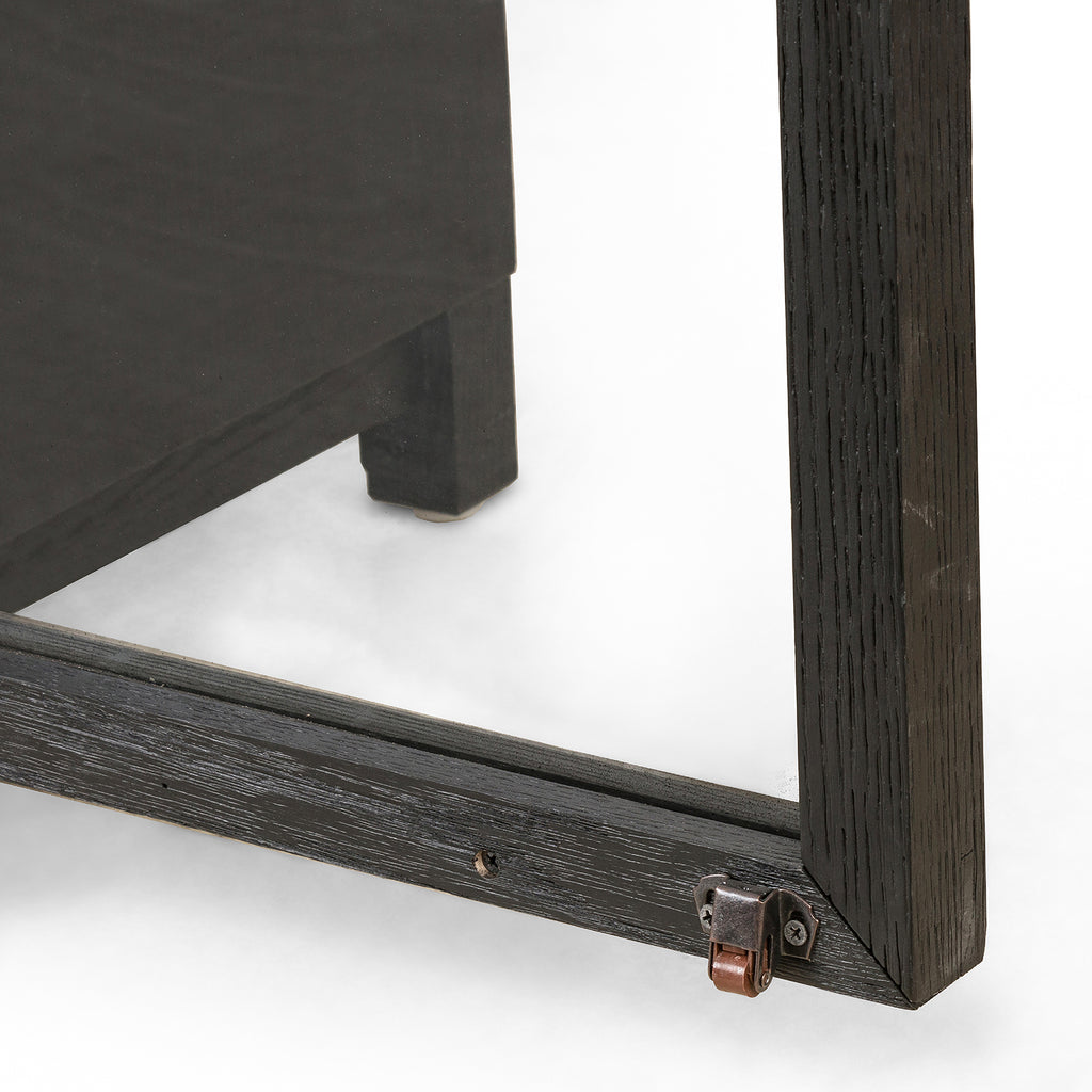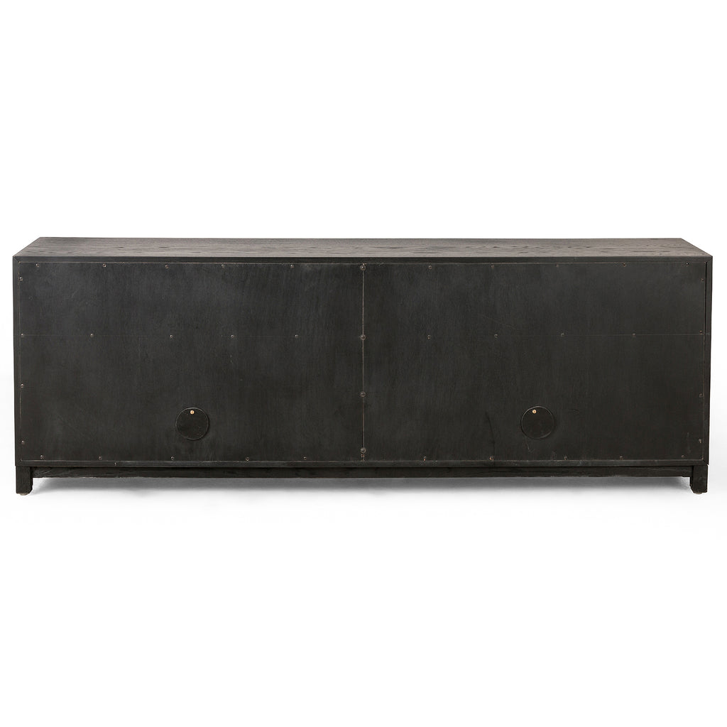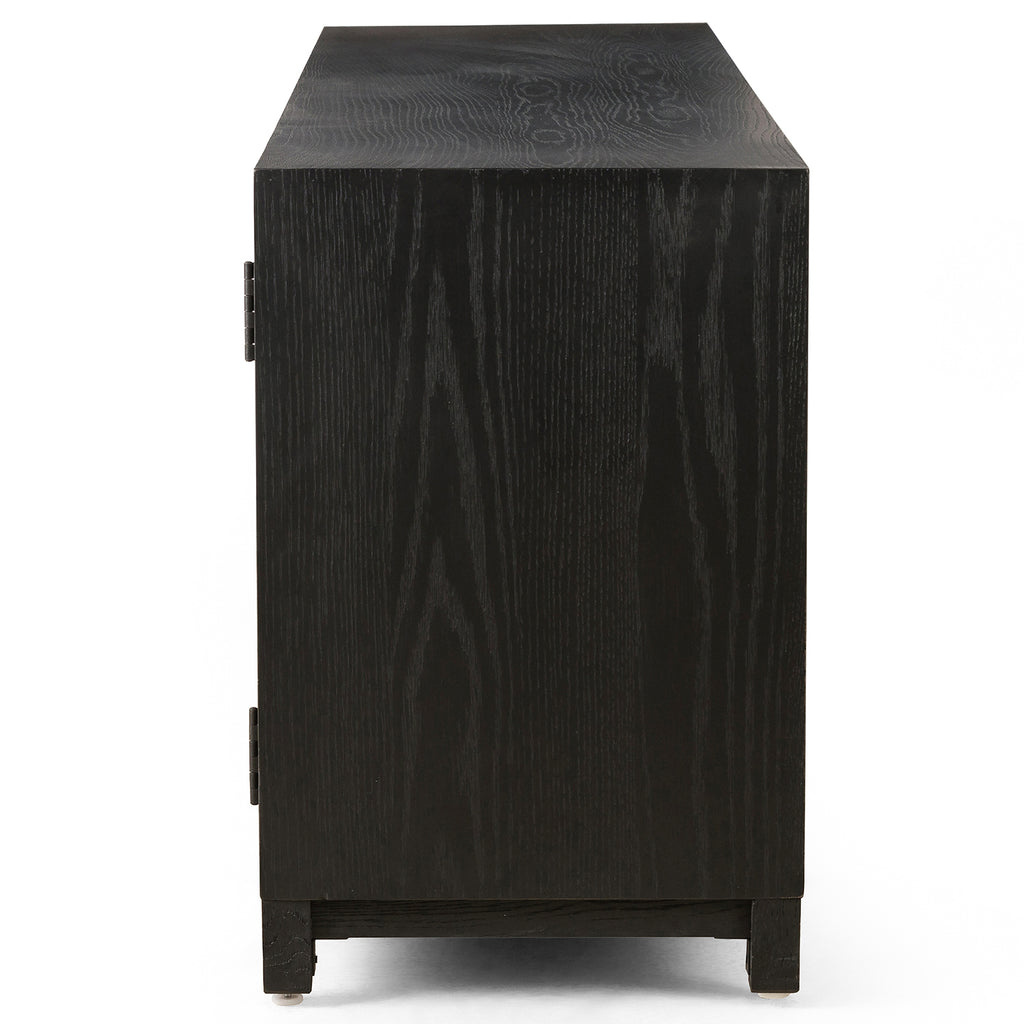 Black drifted oak encases light interior shelving for subtle but striking contrast. Glass doors allow for prized possessions to dazzle on display while spacious interior drawers add out-of-sight storage options.