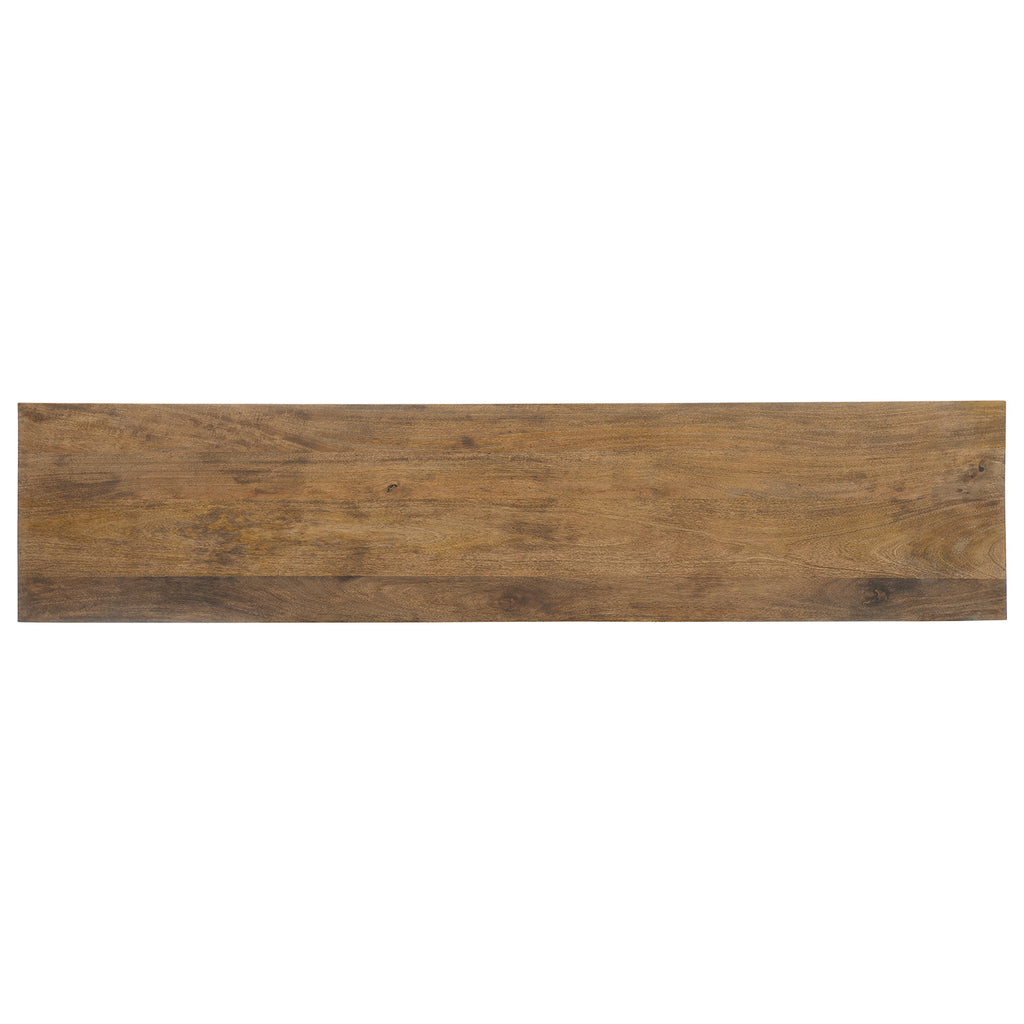 Globally inspired with a modern aesthetic, the Giovanni Entertainment Console combines bone inlay and slate veneer in an artistic treatment on the door fronts. Crafted of Mango Wood with Bone Inlay and an iron base, the console has one fixed wood shelf each pair of doors, a ventilated back panel and wire management.