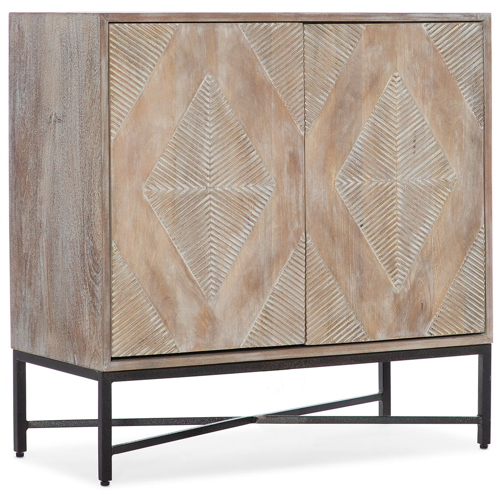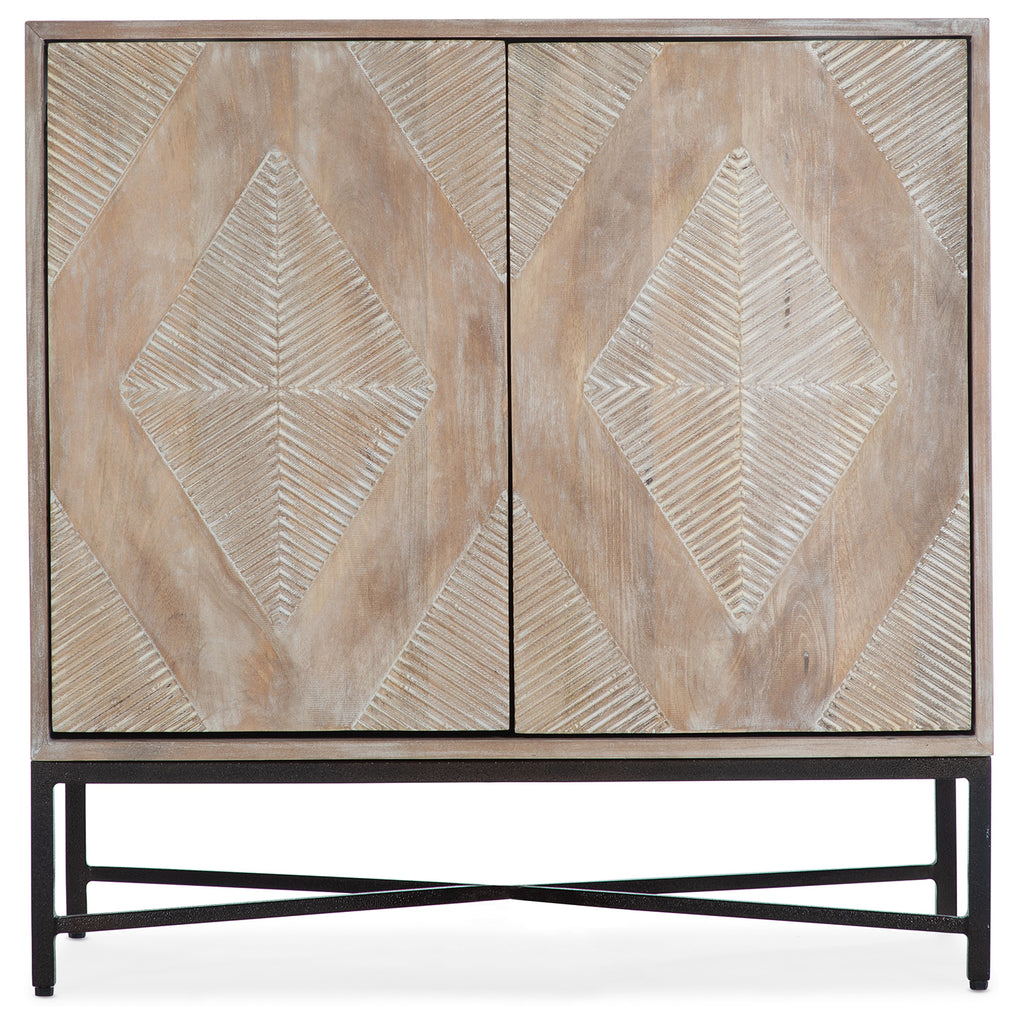 Offering a casual modern rustic design with a tribal flair, the Commerce & Market Two-Door Chest is crafted of Mango Solids and Iron with carved front doors with diamond motifs, There’s one adjustable wood shelf the doors and a metal base.