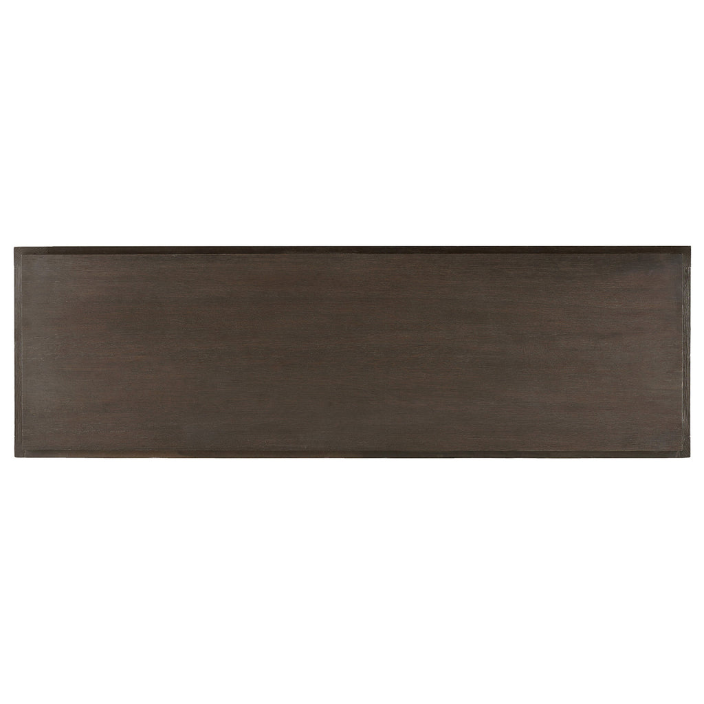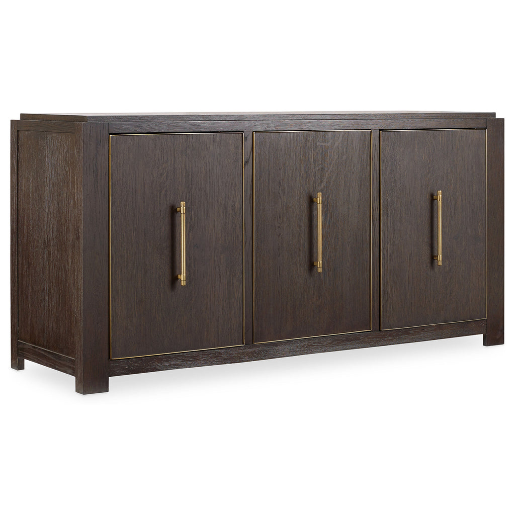 Inspired by timeless simple shapes with a chic mixture of tactile materials, the Curata Buffet Credenza is crafted of White Oak Veneers with an earthy Midnight finish accented by vertical brushed brass pulls on each of the 3 doors. There are two adjustable shelves each door for roomy storage.