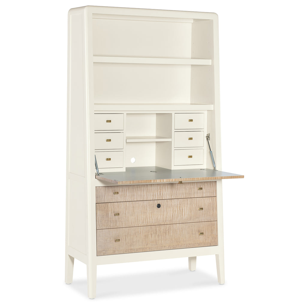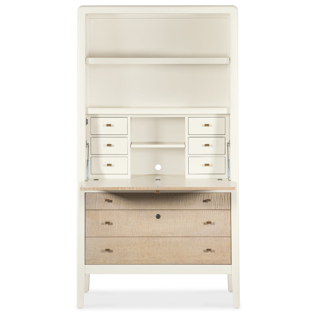 Contrasting a serene Almond White finish with Maple and Figured Maple Veneers on the drop-down front and drawer fronts, the Hera Hub gets you organized and keeps clutter out of sight. Perfect for the kitchen, bedroom, loft or living space, it has one adjustable wood shelf in the top section and one fixed wood shelf in the top section. The drop-front writing surface opens to reveal 6 small drawers and one adjustable wood shelf. There’s a cutout in the back panel for wire management and two bottom drawers underneath the drop-front area. The top drawer has a cream-colored removable felt-lined tray, and the bottom drawer has a lock and two compartments. The right compartment has hanging file storage. The left compartment has a removable tray.