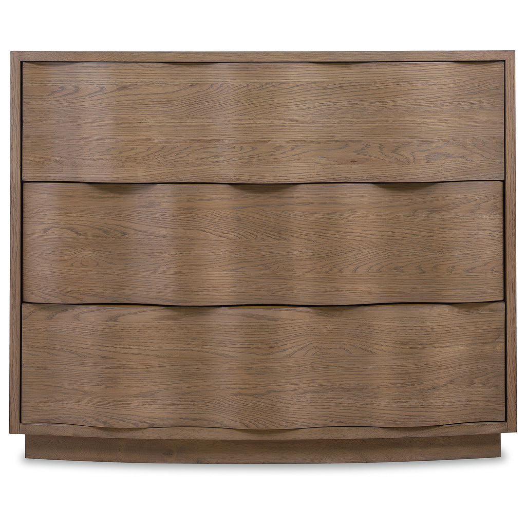 A stylistically versatile dresser blending natural textures with a light-and-airy modern aesthetic, the Sonnet bow-front Bachelors chest has 3 push-open drawers with shaped-wave drawer fronts. Crafted of Quartered and Cathedral-Cut White Oak Veneers, it has a light earthen-toned finish. The top drawer has a cream-colored removable drop-in left liner. The plinth base adds chic modern appeal.