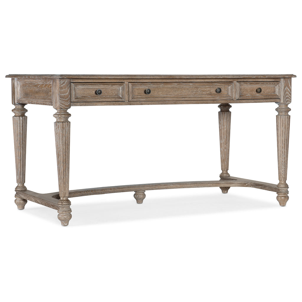 Traditional with a twist, the Sutter Writing Desk is crafted of Cathedral Oak Veneers with a classic silhouette and designer details such as shaped fluted legs, spool feet and a curved stretcher. The finish is a casual clear Oak revealing the tactile veneer pattern for a reclaimed look, with champagne-colored pulls and knobs. Featuring 3 drawers, the left and right drawers have a removable pencil tray and a writing slide that can be used in either drawer. The center drawer has a drop-front for keyboard use. A power supply is located in the back of the keyboard drawer.